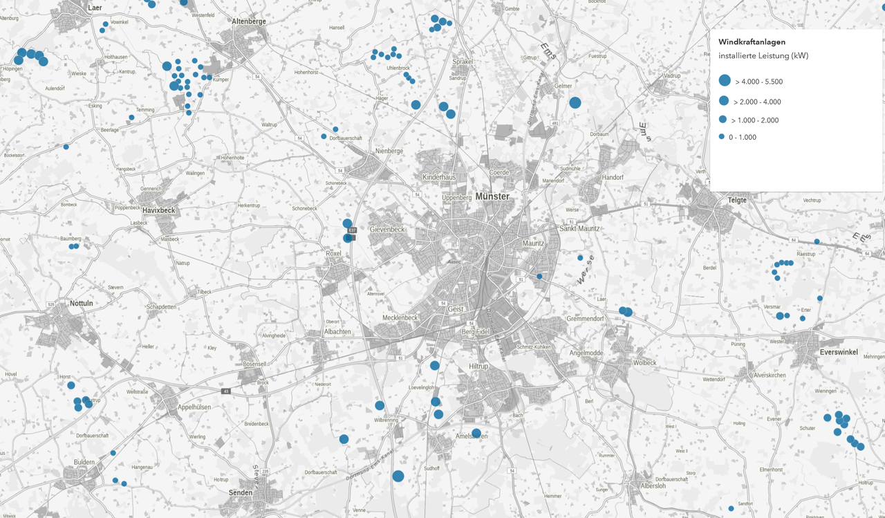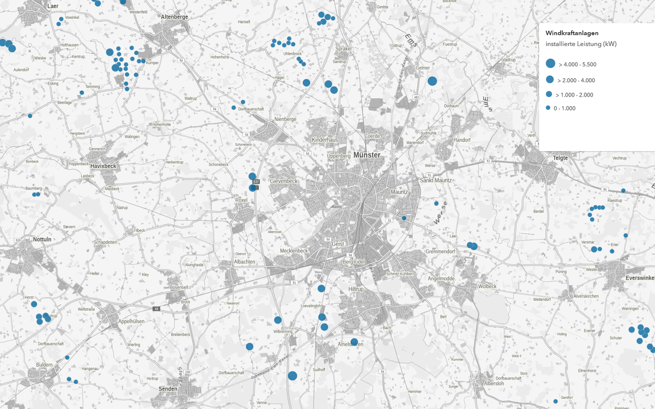 Dennoch lässt sich mit ihnen bisher nur fünf bis zehn Prozent des Gesamtstrombedarfs erzeugen. Münster hat hier in den vergangenen Jahren aber deutlich aufgeholt, denn die Anlagen hier bei uns im Stadtgebiet sind zudem noch vergleichsweise neu. Ein Großteil von ihnen ist erst in den vergangenen 10 Jahren entstanden. Sie produzieren mittlerweile aus Wind Strom für Tausende Haushalte in Münster.