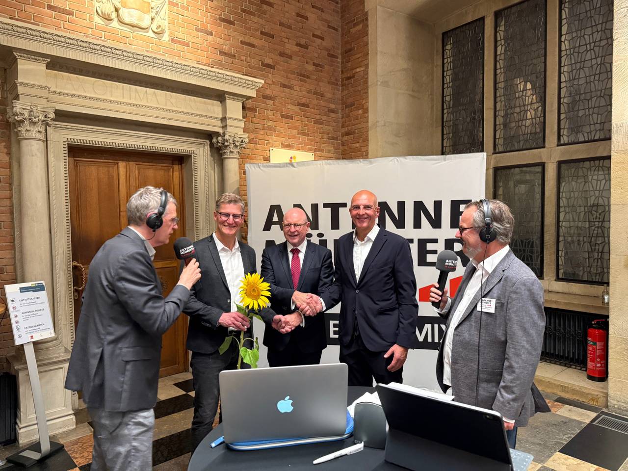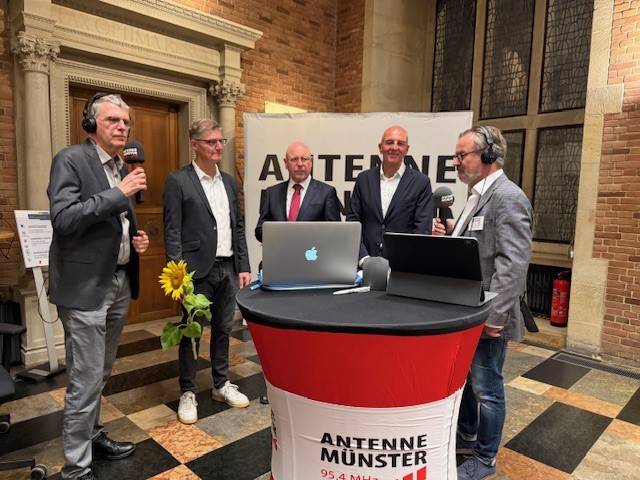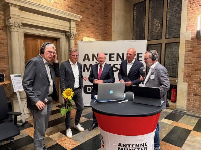 In einer ANTENNE MÜNSTER-"Elefantenrunde" haben sich der nächste Oberbürgermeister Tilman Fuchs, der noch amtierende Oberbürgermeister Markus Lewe (CDU) und der unterlegene Kandidat Dr. Georg Lunemann im Rathaus mit ANTENNE MÜNSTER-Chefredakteur Stefan Nottmeier und Chefreporter Matthias Menne getroffen: