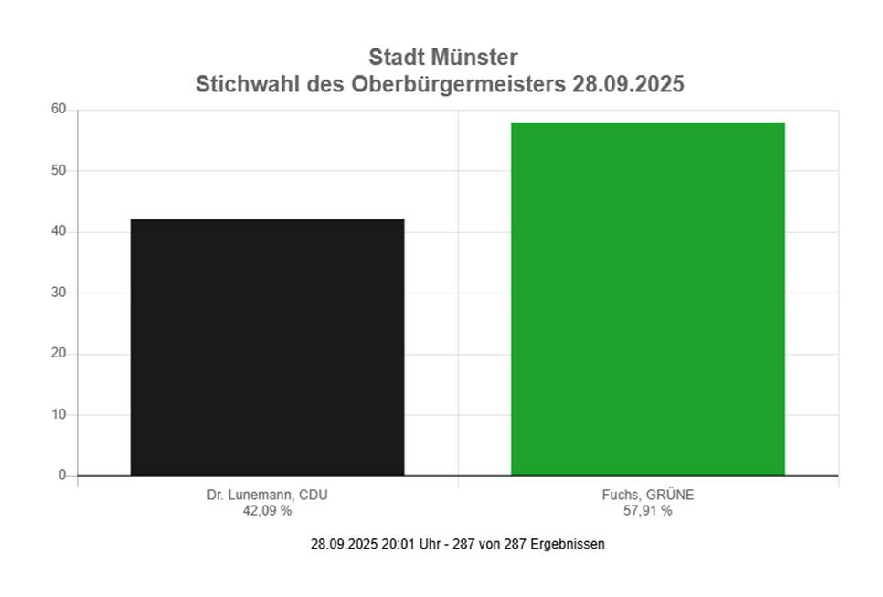 Tilman Fuchs (Grüne) wird neuer Oberbürgermeister von Münster. Das ist das Ergebnis der Stichwahl am Sonntagabend (28.09.). Am Ende der Auszählung standen 57,91 % der Stimmen für Fuchs (Grüne) und 42,09 % für Dr. Lunemann (CDU) zu Buche. Hier gibt's alle Stimmen von Gewinner, Verlierer - und dem Noch-Oberbürgermeister.