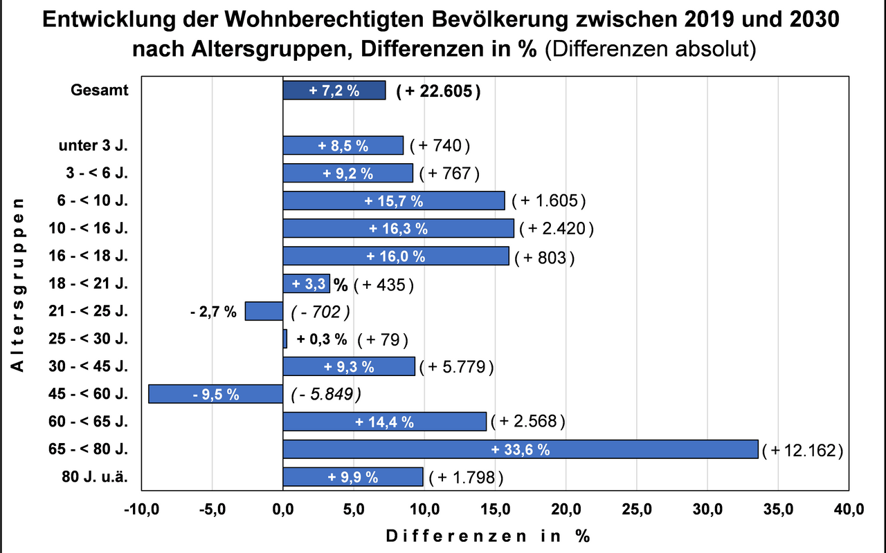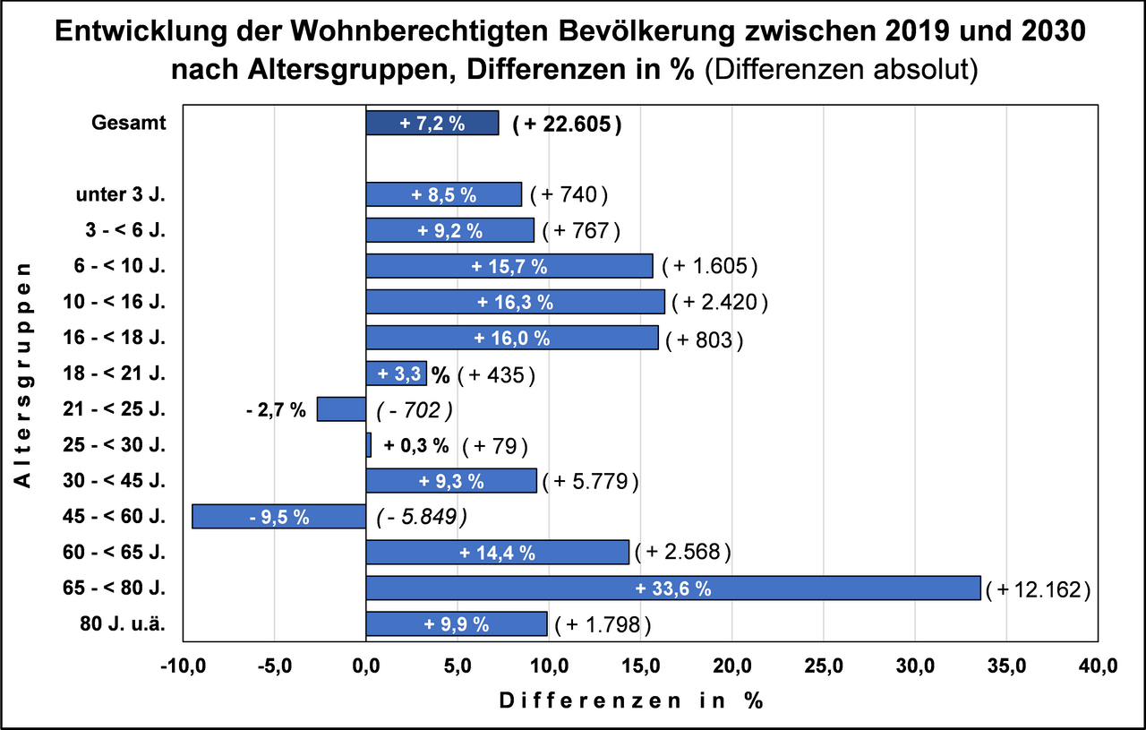Entsprechend den Ergebnissen der Prognose ist bis 2030 mit einer Zunahme in den Altersgruppen unter 3 Jahren (+ 8,5 %) und 3 bis unter 6 Jahren (+ 9,2 %) zu rechnen. Ein starkes Anwachsen zeigt sich auch für die Altersgruppen 6 bis unter 10 Jahren (+ 15,7 %) und 10 bis unter 16 Jahren (+ 16,3 %).