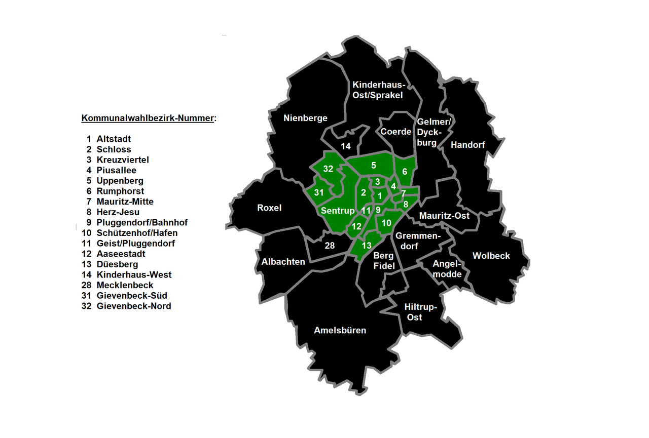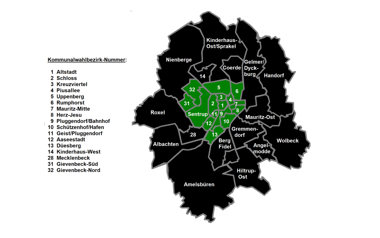 Die Grünen sind vor allem in den Innenstadt-Stadtteilen stark: Die besten Wahlergebnisse holten sie im Bereich Schützenhof/Hafen (36%) und im Herz-Jesu-Viertel an der Wolbecker Straße (35%). In den äußeren Stadtteilen schnitten die Grünen dagegen schwächer ab, besonders schwach ist ihr Wahlergebnis in Amelsbüren (18%) und Hiltrup-Mitte (19%).