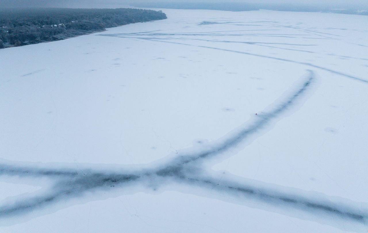 Abgesehen von vereinzelten offenen Engstellen liegt eine geschlossene Eisdecke über den Mecklenburger Oberseen.© Jens Büttner/dpa