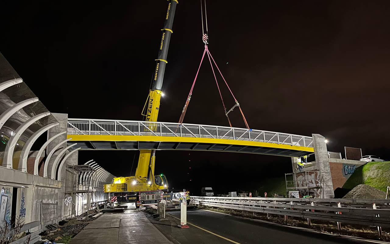 In der Nacht zu Freitag (29.11.) wurde die neue Brücke "Jägersteg" über die B51, Umgehungsstraße Münster, erfolgreich eingehoben.