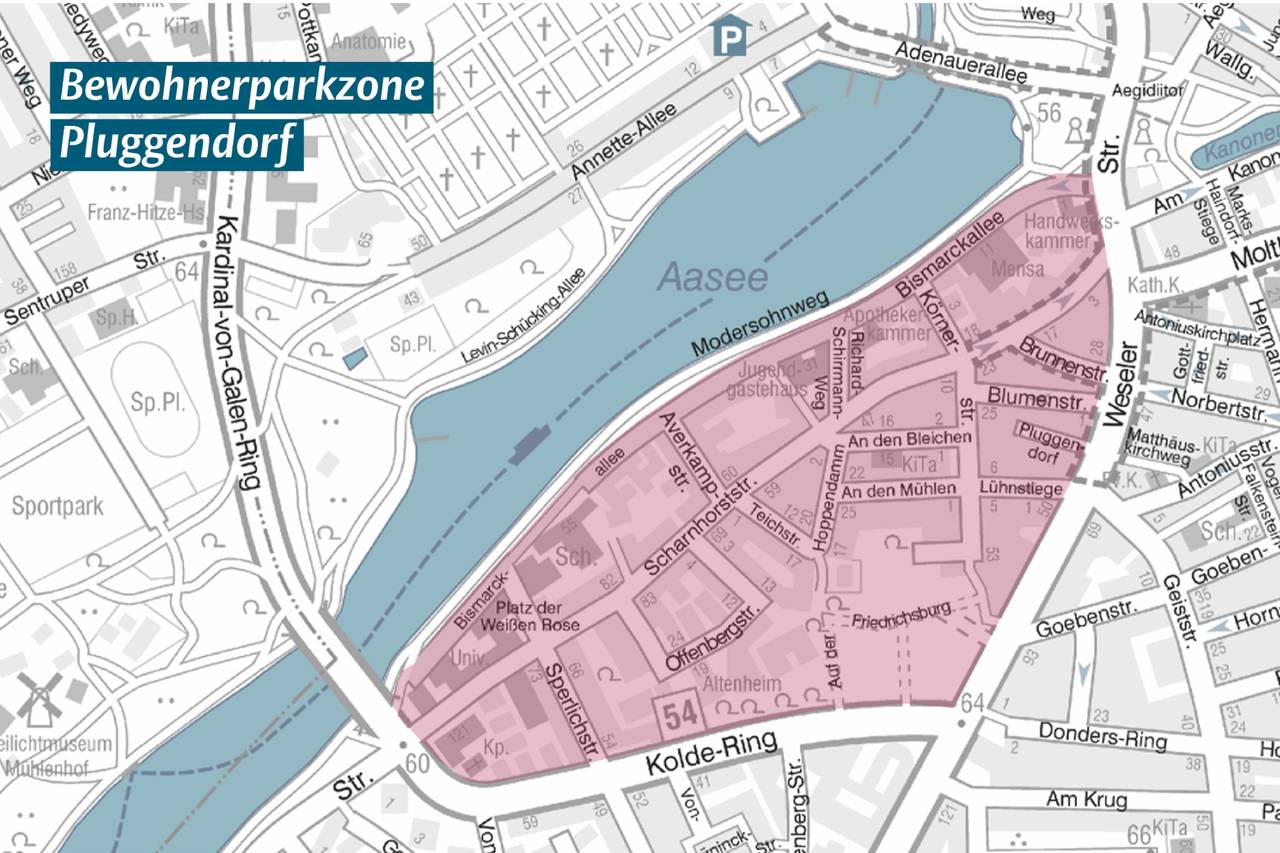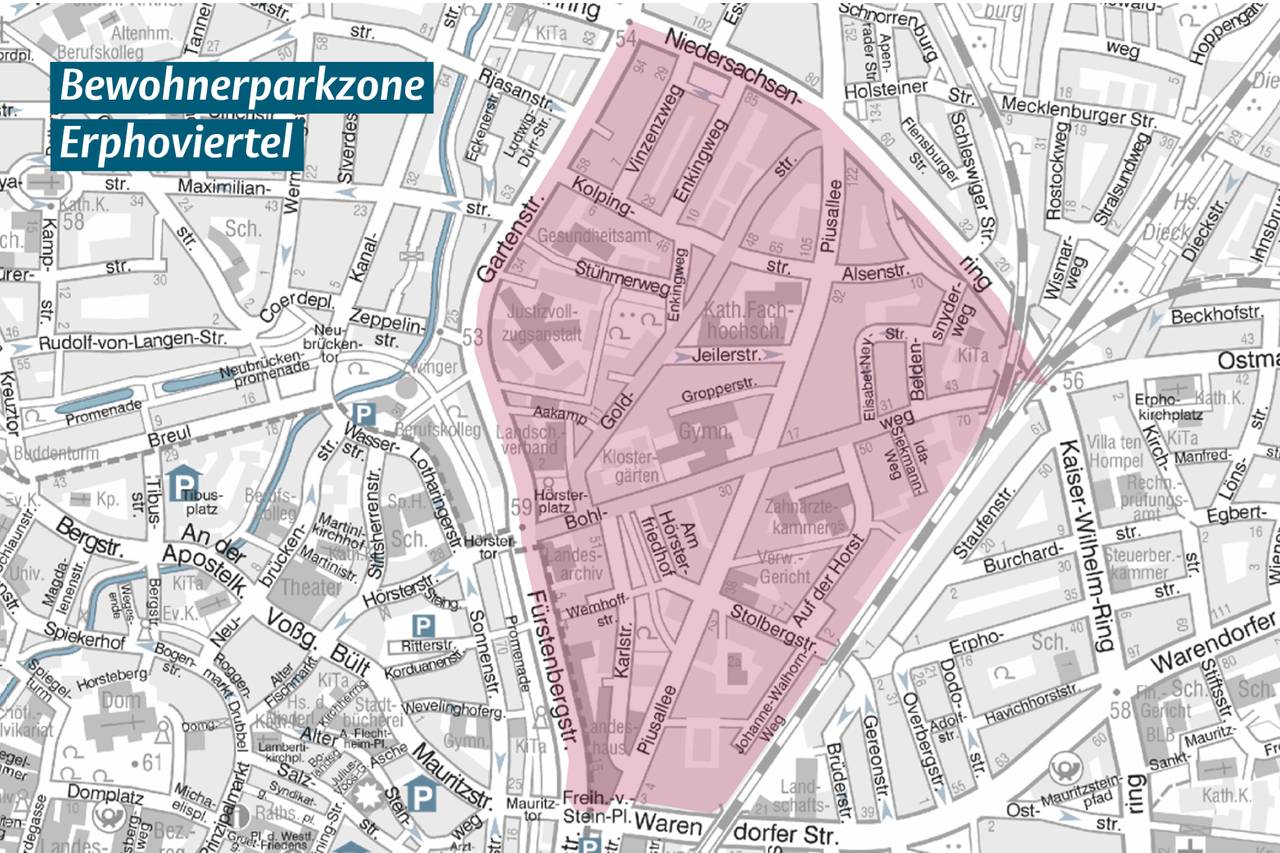 Die Bewohnerparkzone Erphoviertel liegt zwischen Gartenstraße, Bahnschienen und Niedersachsenring. Die Zone Pluggendorf wird sich zwischen Bismarckallee, Weseler Straße und Kolde-Ring erstrecken. Wer dort seinen Hauptwohnsitz hat, kann für jeweils ein Auto mit einer Länge von weniger als 5,25 Meter einen Bewohnerparkausweis beantragen.