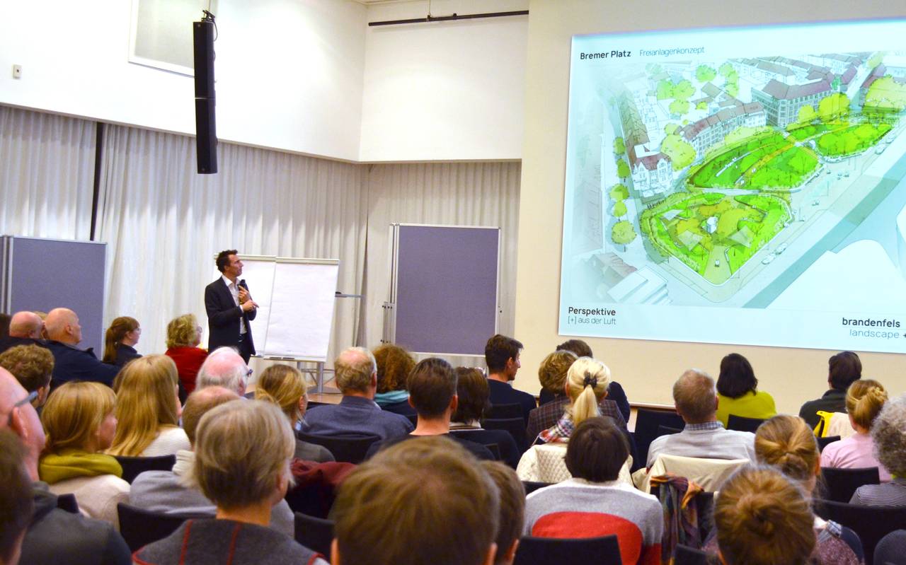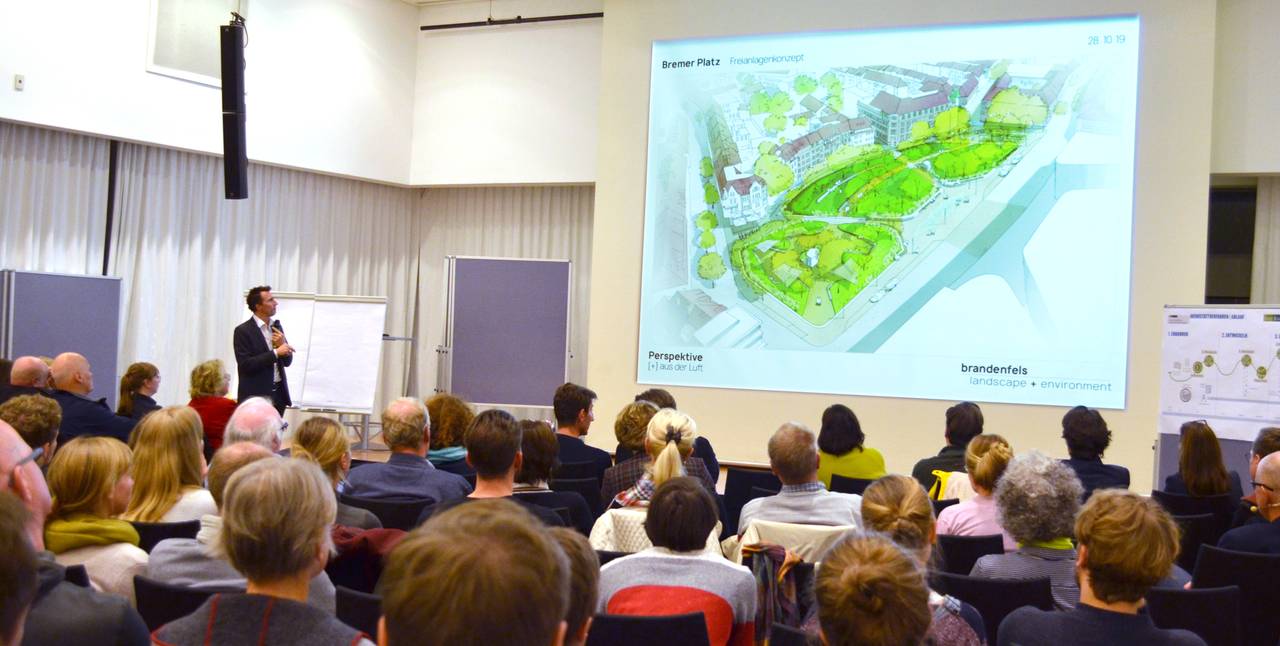 Organisiert wurde das Beteiligungsverfahren vom Amt für Grünflächen, Umwelt und Nachhaltigkeit. In drei Planungswerkstätten hatten die Bürger die Möglichkeit, ihre Vorstellungen und Wünsche zur Zukunft des Bremer Platzes einzubringen und die von drei Landschaftsarchitekturbüros parallel erarbeiteten Entwürfe zu kommentieren und zu bewerten.