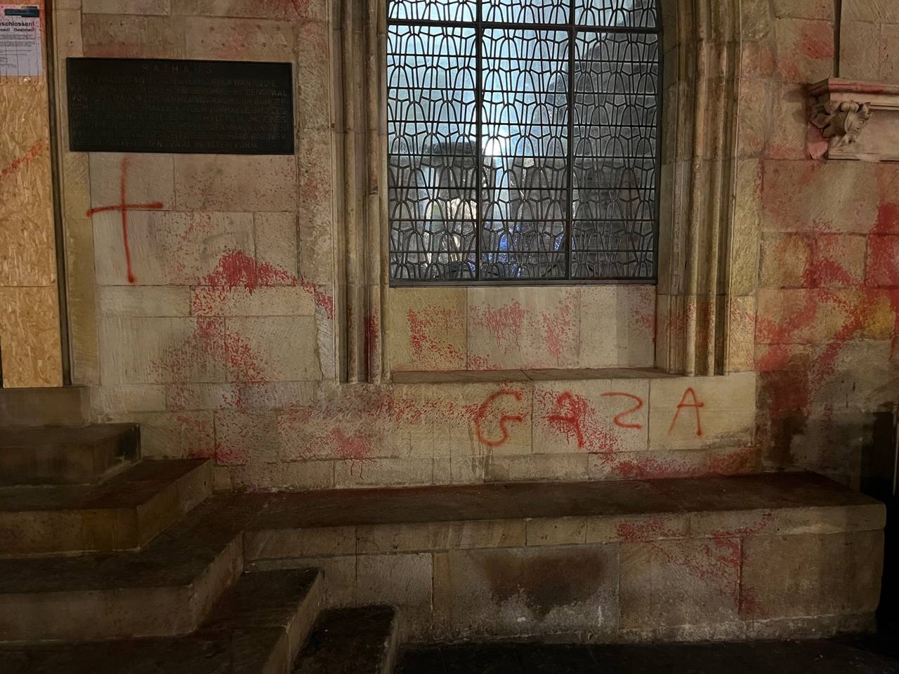 Immer wieder versuchen Unbekannte so, pro-palästinensische Botschaften zu hinterlassen. Seit dem Beginn des Krieges in Gaza vor mehr als eineinhalb Jahren wurden immer wieder bekannte Häuser und Gebäude in Münster beschmiert. Die Polizei konnte bislang keine Täter:innen ausfindig machen. Auch nicht, nachdem vor dem Rathaus eine Videoüberwachung installiert wurde, weil auch dort rote Schmierereien aufgetaucht waren.