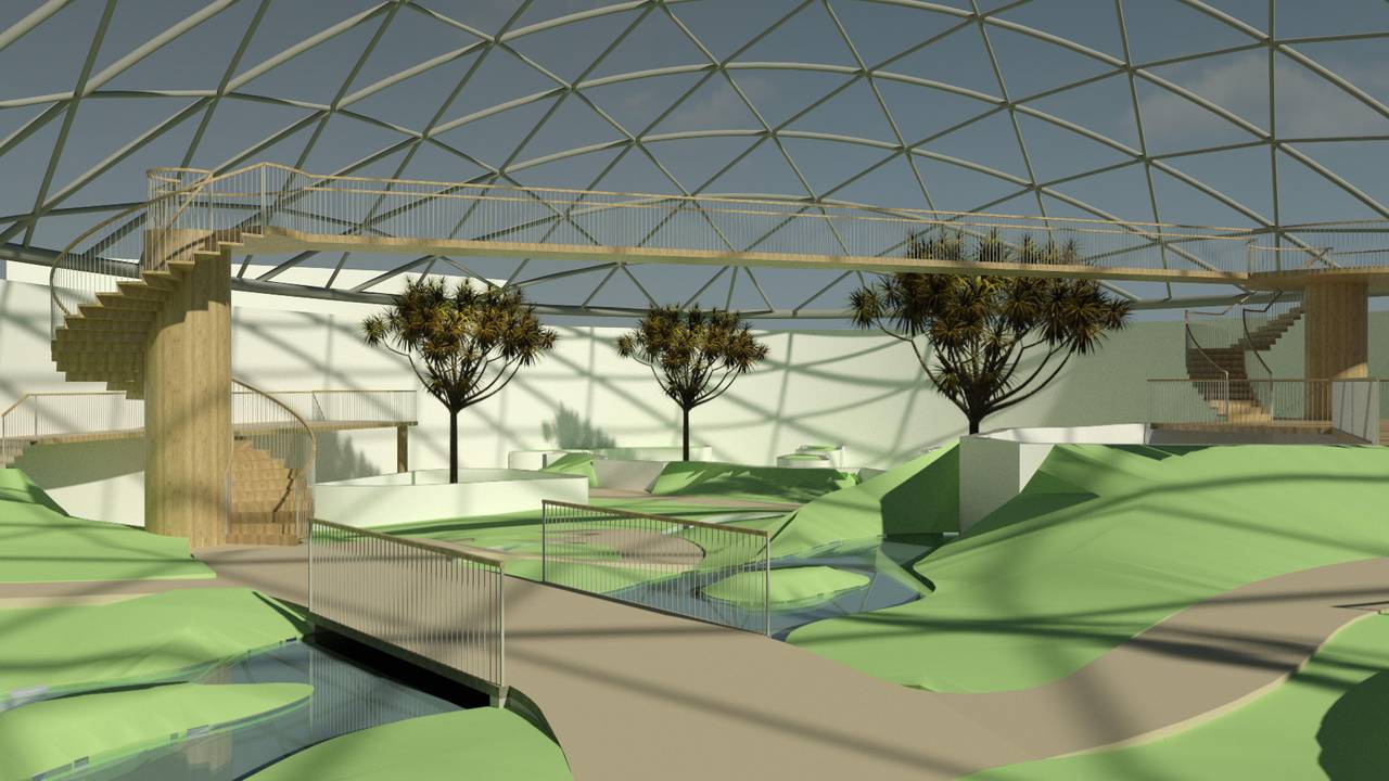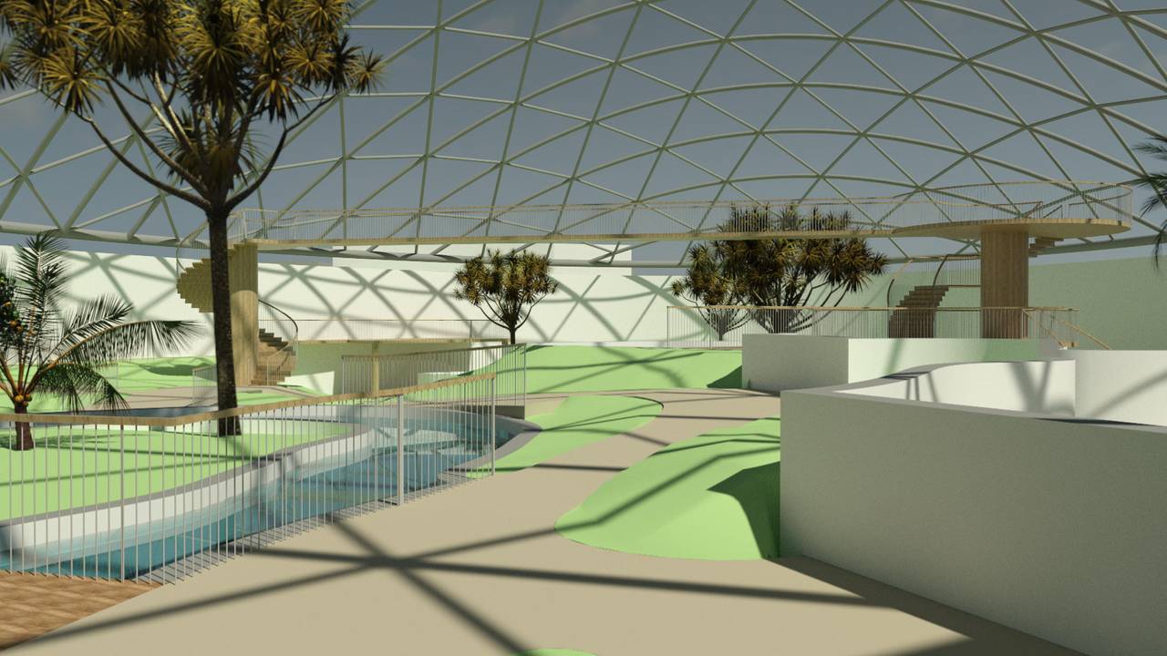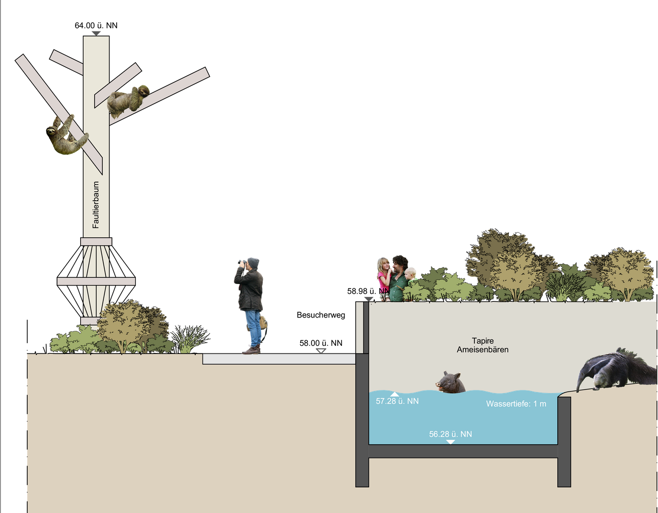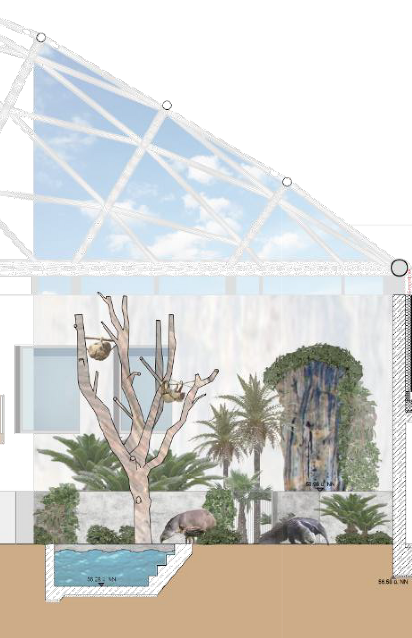 Unter anderem Riesenotter, Brüllaffen, Faultiere und Ameisenbären ziehen in die Halle ein. Aber auch für Reptilien und tropische Vögel ist Platz. Für die Halle gibt es ein umfassendes Nachhaltigkeitskonzept mit Erdwärme, Photovoltaik und einem sonnendurchlässigen Foliendach.
