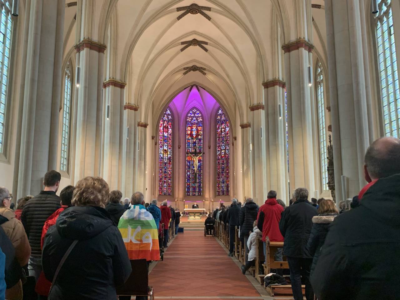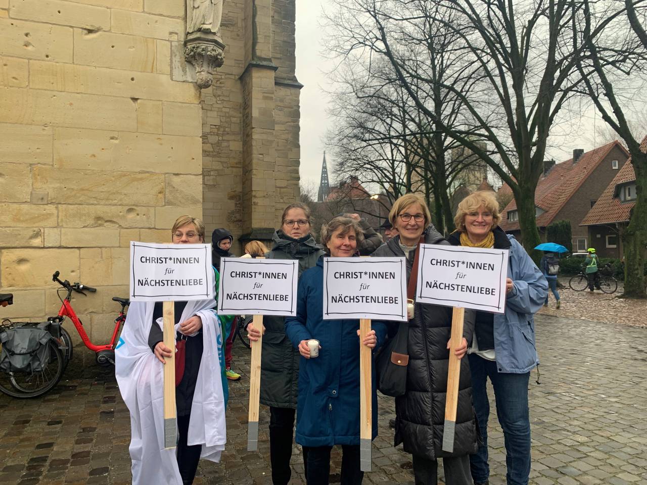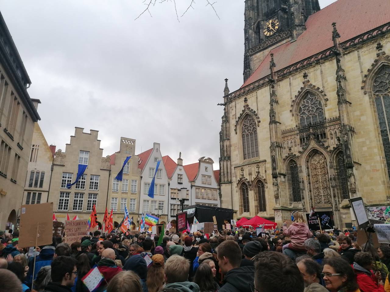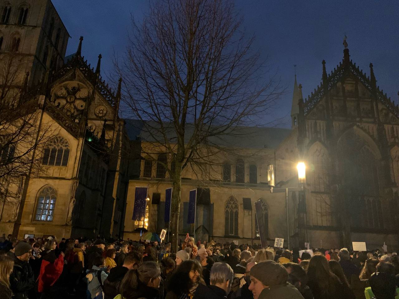 Vor Beginn der Demo hatten die christlichen Kirchen zum Friedensgebet um 15:30 Uhr in der Überwasserkirche eingeladen. Die Kirche war mit ca. 1.000 Menschen bis auf den letzten Platz gefüllt.
