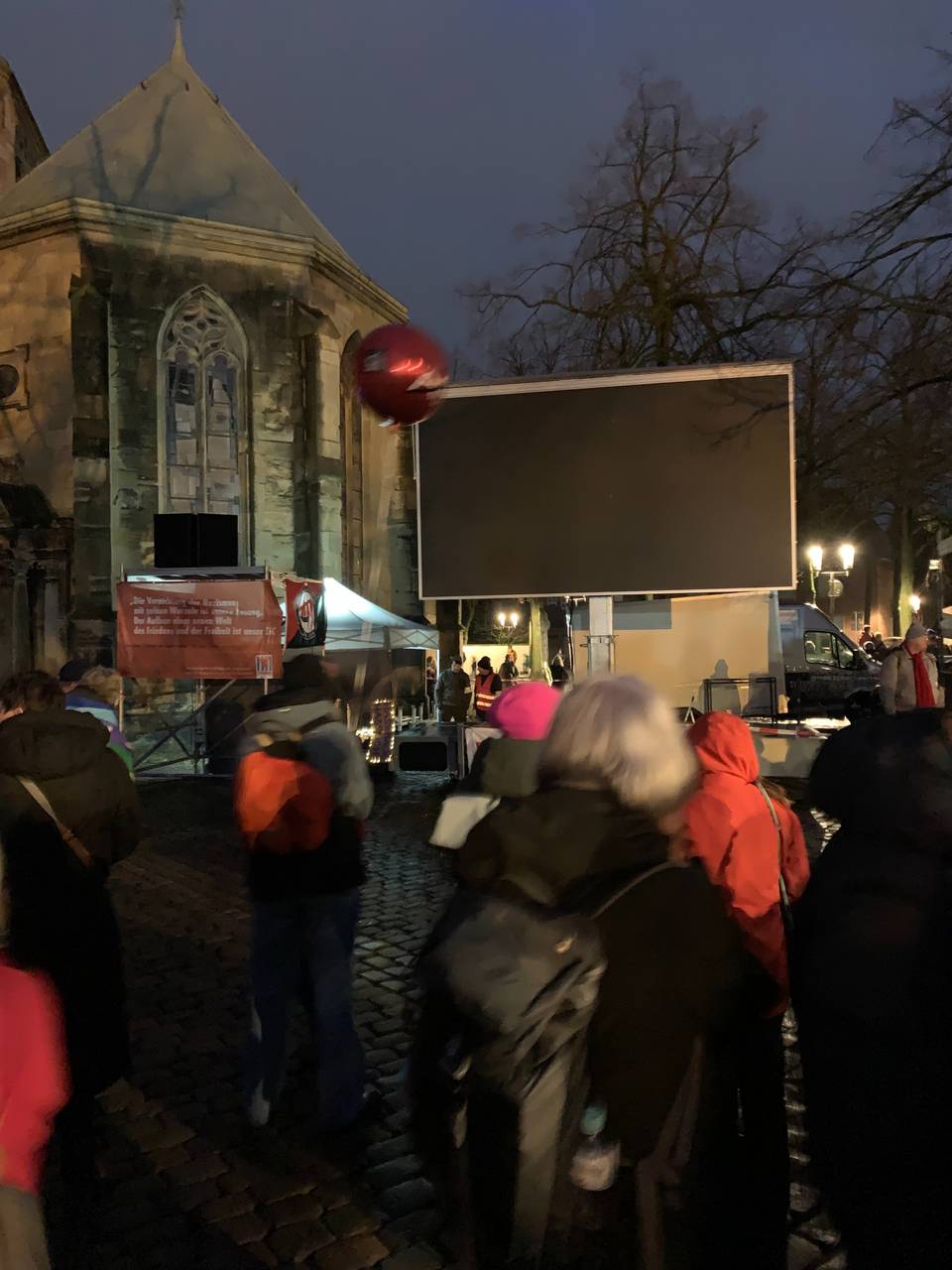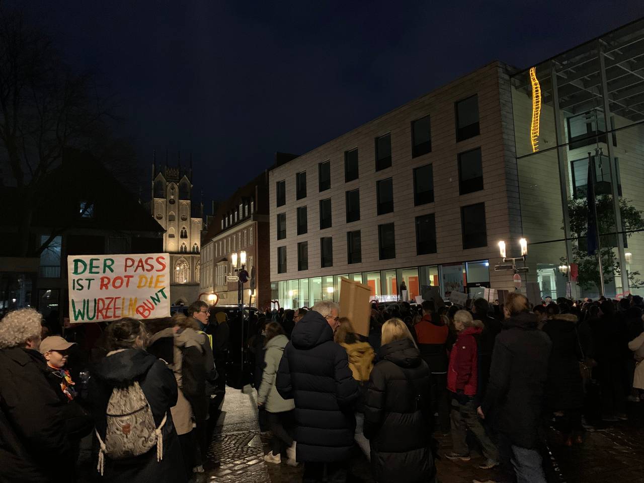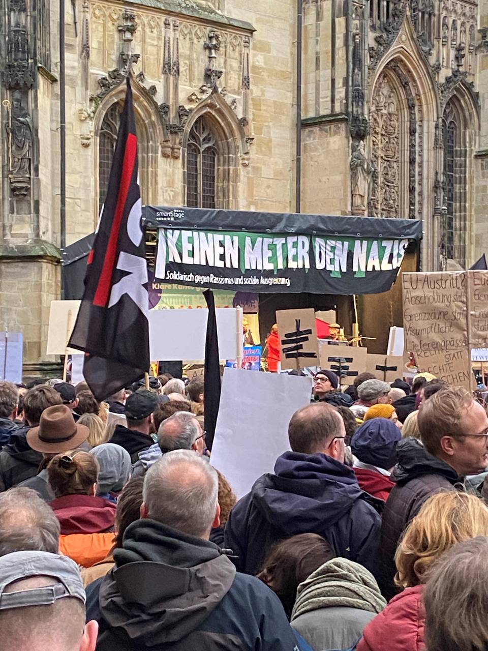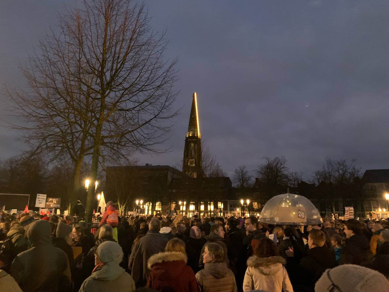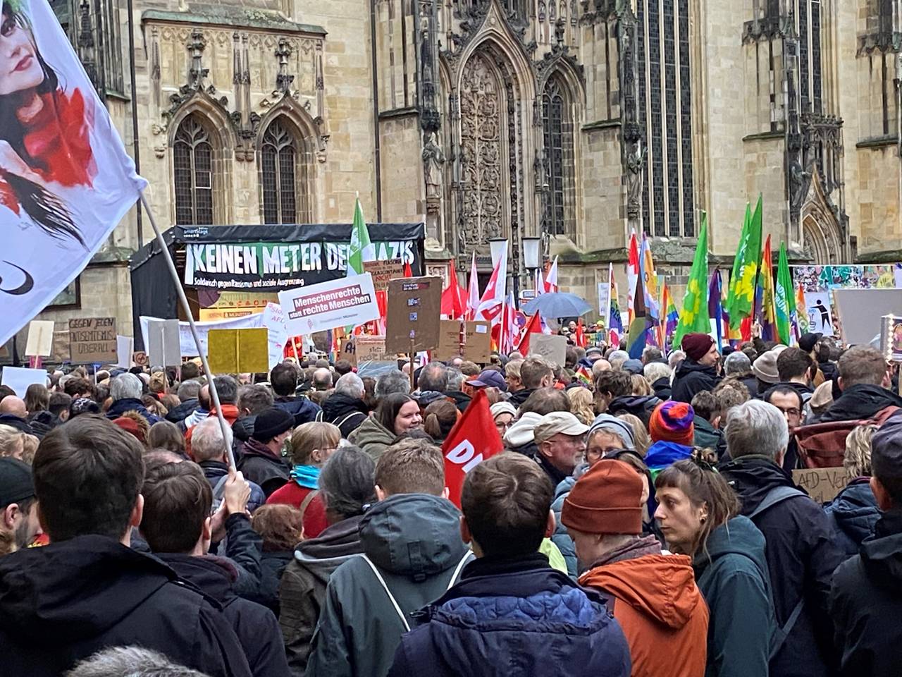 Angemeldet hatten die Veranstalter bei der Polizei 1.500 Teilnehmer. Diese Zahl aber war bereits zum Auftakt am frühen Abend erreicht. Die Polizei musste früh die Zugänge wegen Überfüllung schließen. Nach den Enthüllungen des Medienhauses Correctiv über ein Treffen radikaler Rechter im November in Potsdam, an dem auch AfD-Politiker sowie einzelne Mitglieder der CDU und der sehr konservativen Werteunion teilgenommen hatten, zog es viele Demonstranten in die Innenstadt. Auf dem Platz vor dem Dom übertrug eine Leinwand das Geschehen von der Bühne.