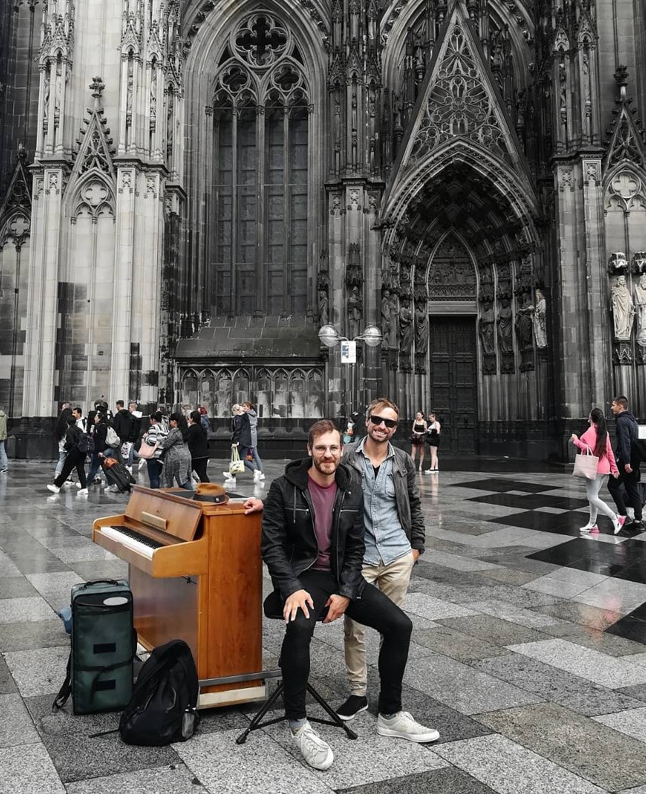 Während viele Menschen in den Sommerferien entspannt Urlaub im Hotel oder einer Ferienwohnung machen, suchen die Freunde Marcel Untiet (oben links im Bild) und Frederik Verboom (oben rechts), genannt Freek, Abenteuer. Beide kennen sich bereits aus Schulzeiten, spielten vor 15 Jahren zusammen in einer Band. Mittlerweile ist Marcel Lehrer, Freek arbeitet als Sozialarbeiter. Die Liebe zur Musik teilen beide bis heute. Die Idee, sich doch mal gemeinsam als Straßenmusik-Duo auszuprobieren, hat sich dann letztes Jahr irgendwie verselbstständigt. Mit Klavier und Saxophon "nur" in Münsters Innenstadt zu spielen, reichte Marcel und Freek nicht mehr.