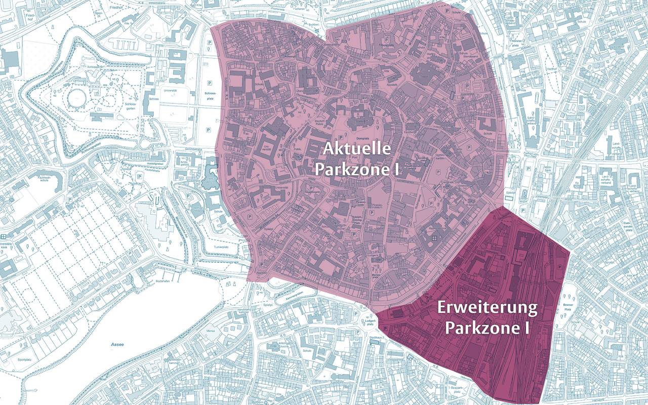 Gleichzeitig soll die zentrale Parkzone I auf das direkte Bahnhofsumfeld ausgeweitet werden. Die bisherige Fläche umfasst den Bereich zwischen Schlossplatz, Am Stadtgraben, Schützenstraße, Münzstraße, Breul, Lotharingerstraße und Klosterstraße. Künftig gehört auch der Bereich zwischen Von-Vincke-Straße, Hafenstraße, Bremer Straße und einem Teil der Wolbecker Straße zur Parkzone I.