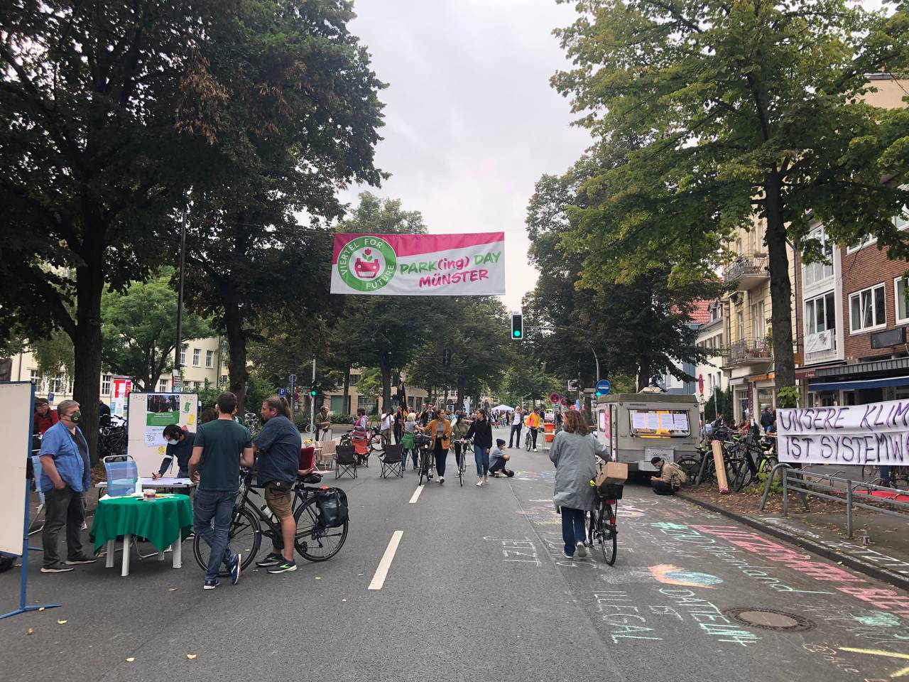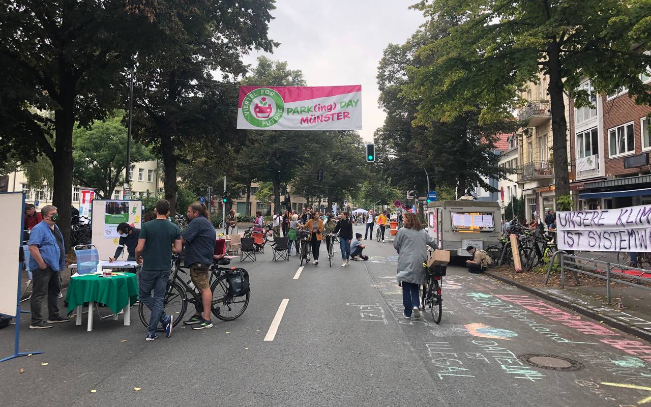 Im Jahr 2019 hatte es mit 25.000 Teilnehmenden eine Rekordbeteiligung an Klimastreik und Park(ing) Day in Münster gegeben. Die Veranstalter:innen erwarten auch in diesem Jahr wieder tausende Teilnehmende. Ziel des Park(ing) Days ist es, die Utopie einer klimagerechten und innovativen Verkehrsplanung aufzuzeigen, die den Menschen und nicht das Auto in den Mittelpunkt stellt und Mobilität für alle ermöglicht.