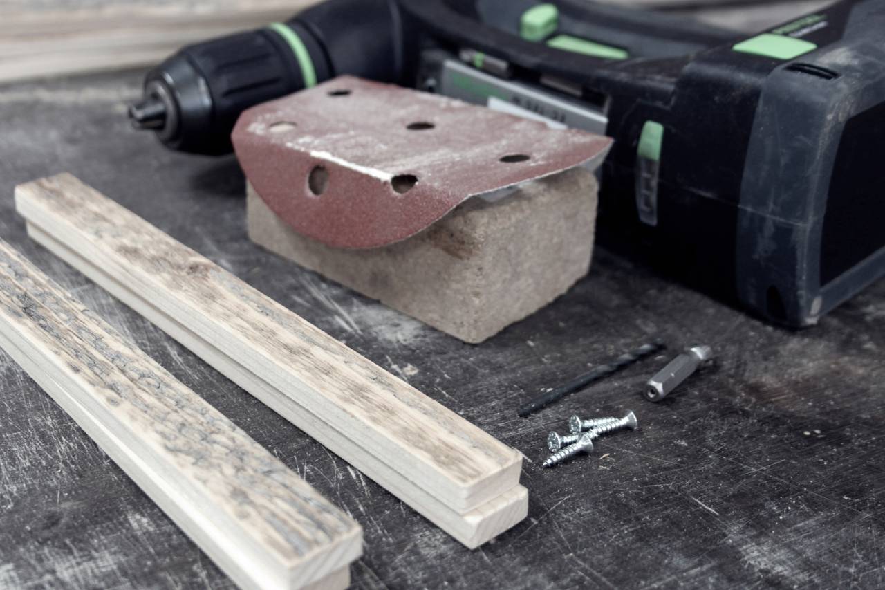 Mit dem Schleifpapier schleifst du die Oberfläche und Kanten der Leisten. Alle Kanten werden außerdem leicht oder je nach Geschmack auch stärker gebrochen oder gerundet. Am besten machst du das mit einem Schleifklotz, dann wird es gleichmäßiger. Richtig geschmeidig wird die Oberfläche, wenn du zum Abschluss mit einem 180er Schleifschwamm über die Fläche gehst.