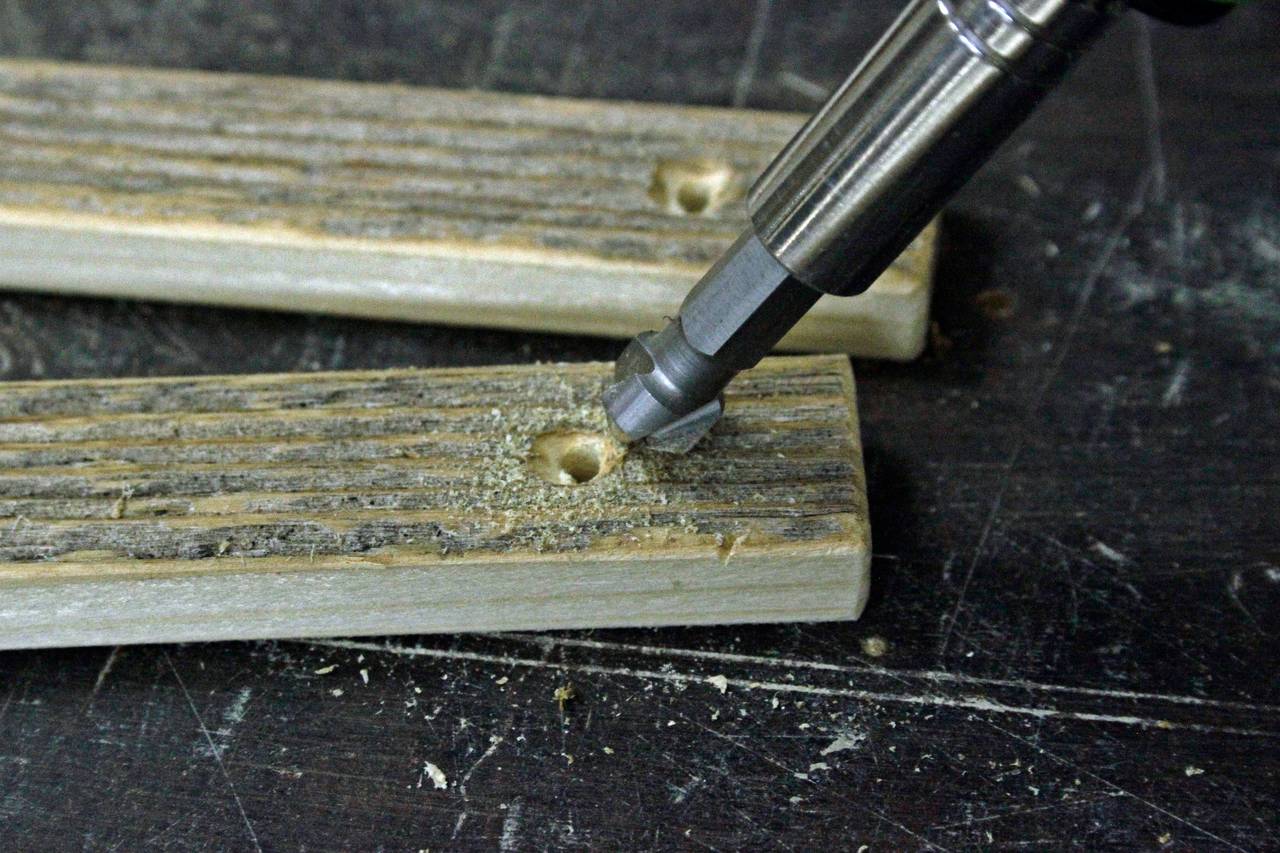 Nun entscheidest du dich, welche Leisten die sichtbaren Deckleisten und welche die verdeckten Wandleisten sein sollen. An der Wandleiste markierst du dir zwei Punkte, je 2 cm vom Rand entfernt. Dort bohrst du mit dem 2,5 mm Bohrer durch die Leiste. An der Außenseite senkst du die Löcher mit einem Aufreiber.