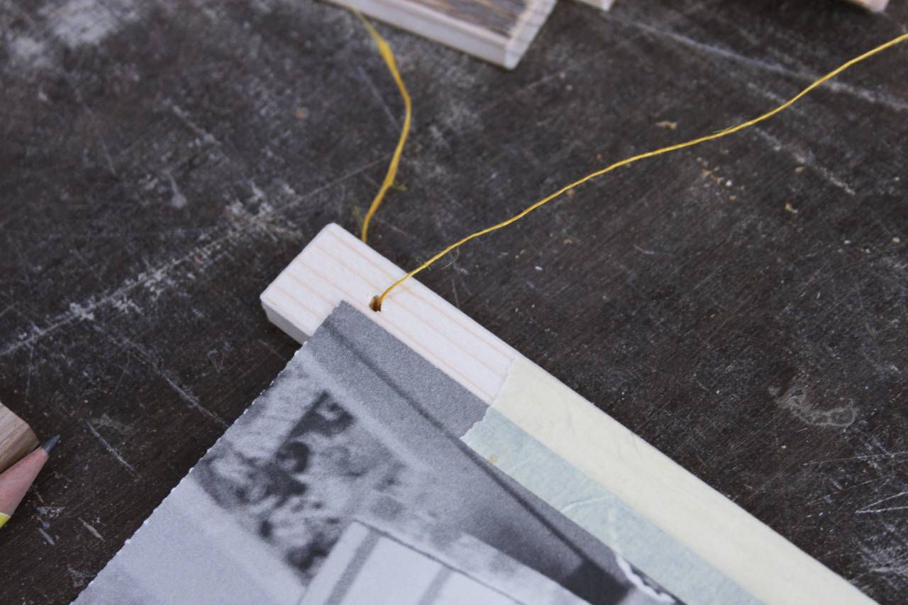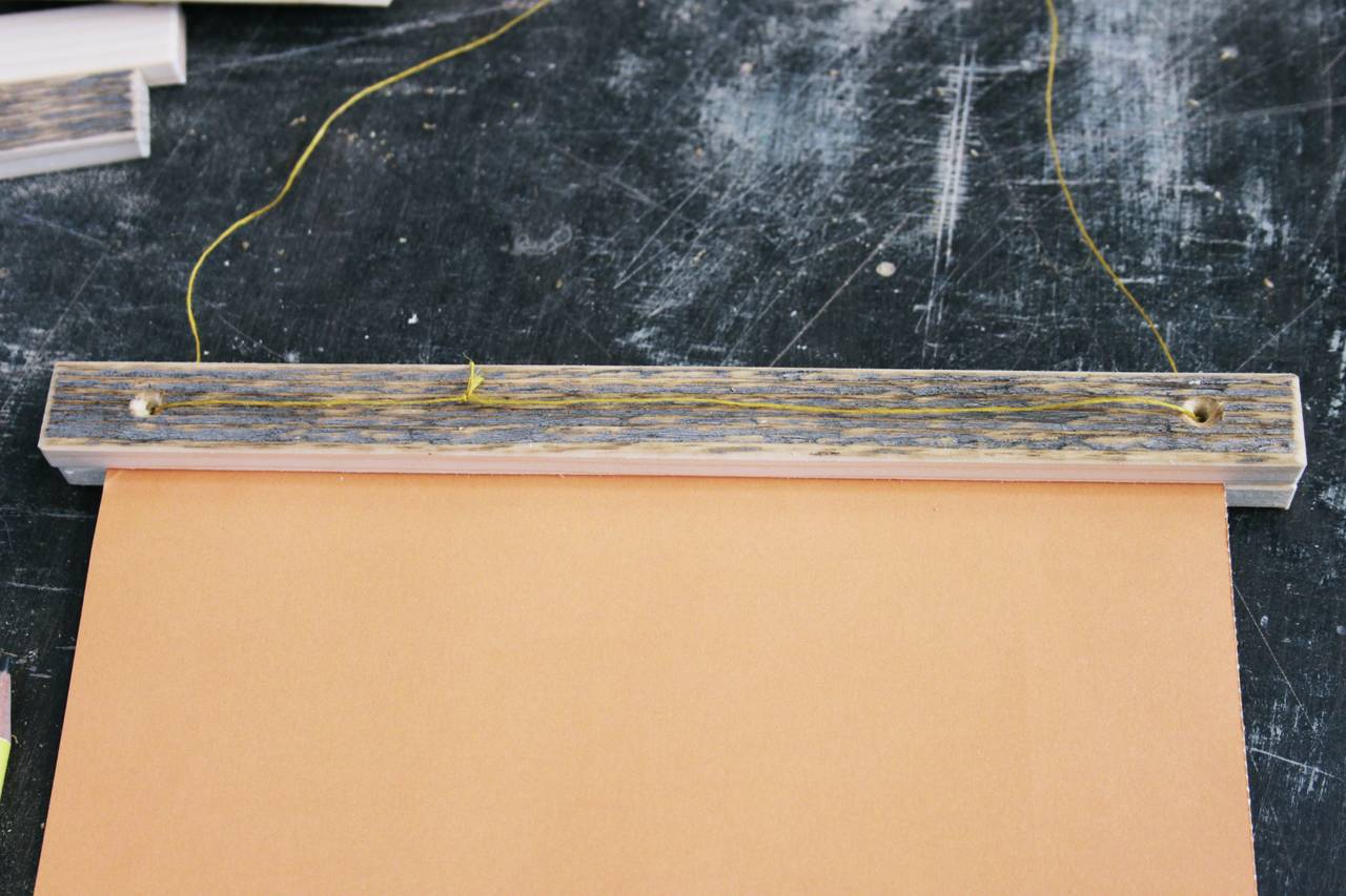 Von innen nach außen kannst du dann den Bindfaden durch die Leiste fädeln. Das Foto oder Poster fixiere ich mit einem Klebestreifen auf der Leiste unterhalb der Löcher, so verrutscht es nicht und wird von der Schraube nicht durchbohrt.