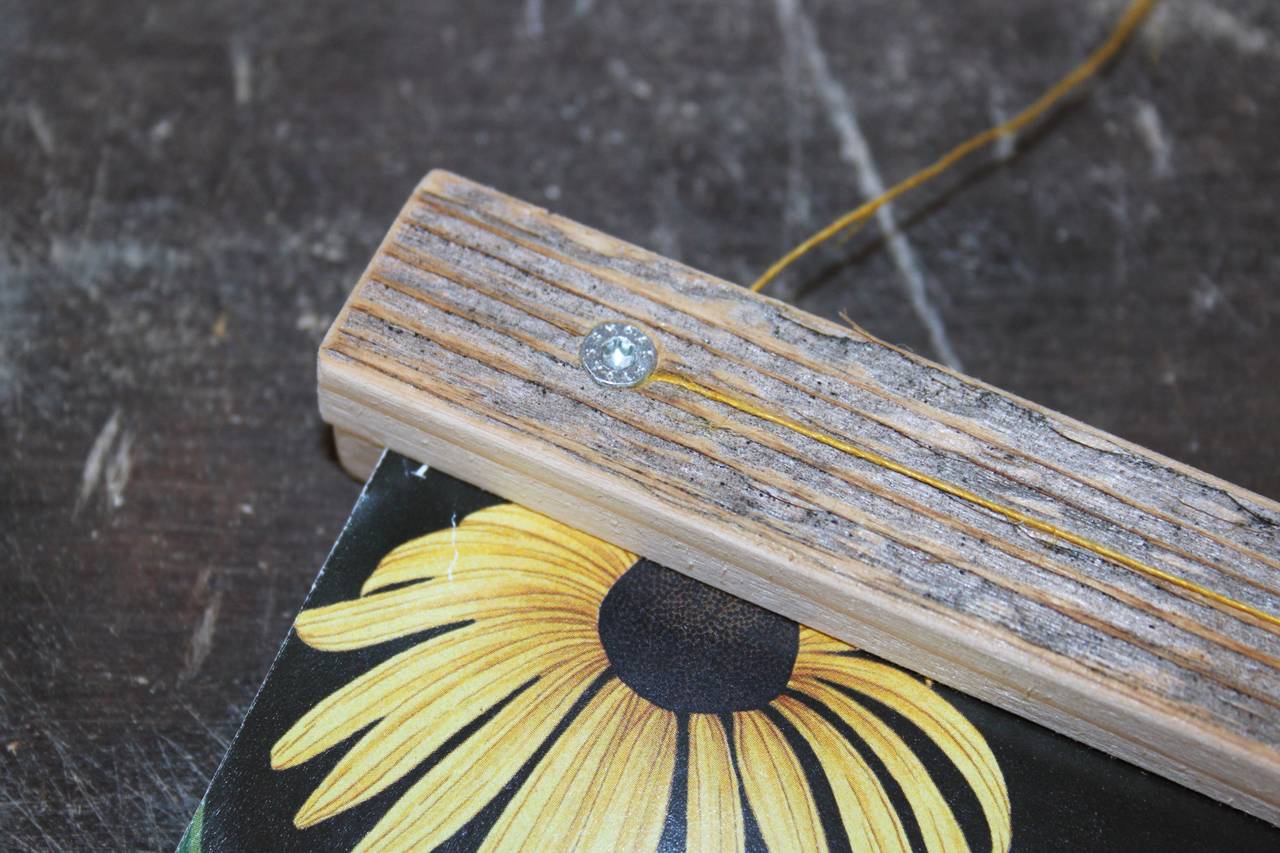 Den Faden kannst du entweder mit einkleben/einschrauben, oder du befestigt oben auf einer der Leisten zwei Aufhänger, an denen du die Bindfäden verknoten kannst.