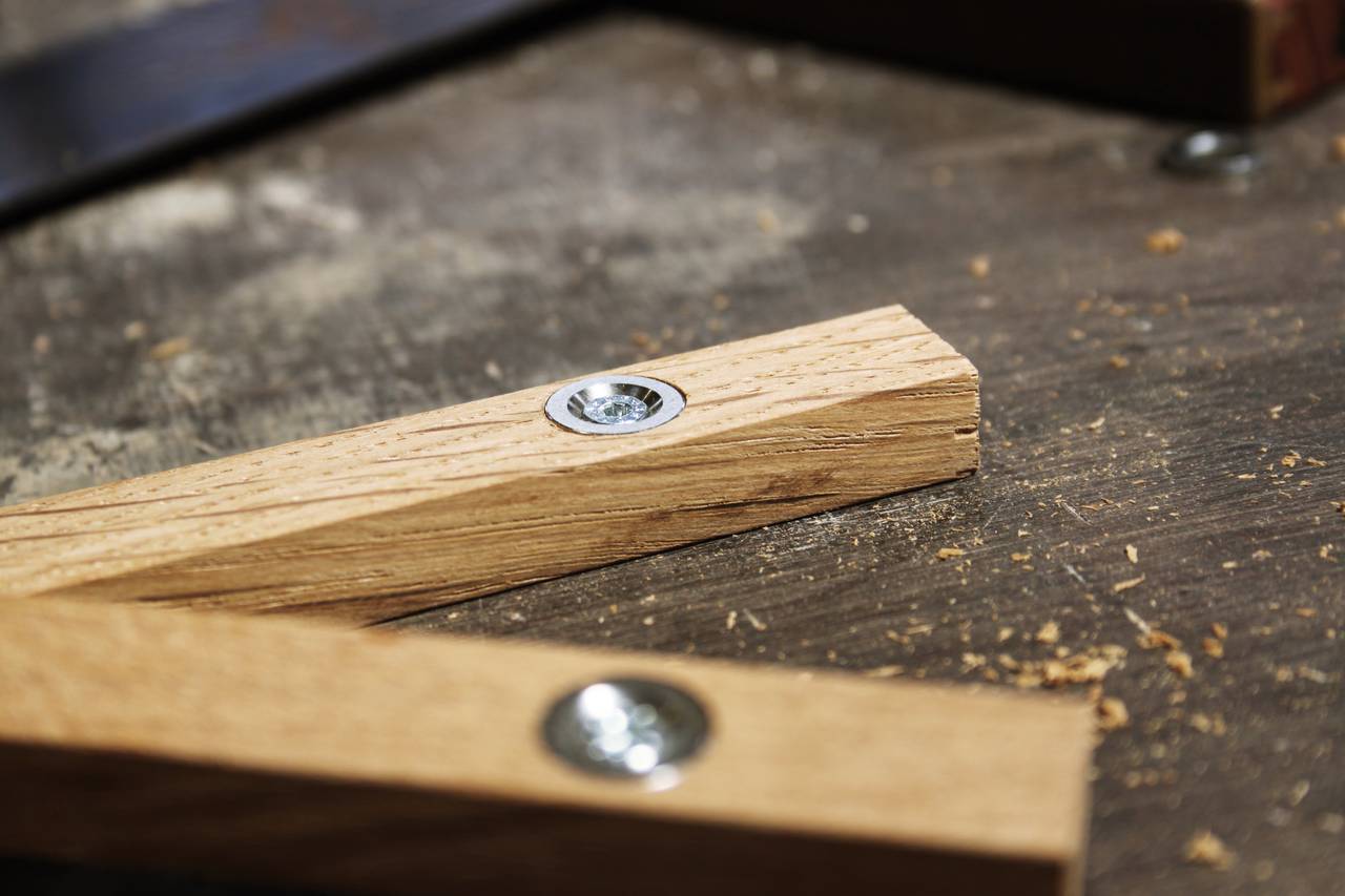 Auf der Innenseite der vier Leisten markierst du jeweils die Position der Magnete. Z.B. 3 cm vom Rand entfernt. Ich habe Magnete zum Einschrauben gewählt, es gibt aber auch genug Magnete, die du nur kleben musst – das geht schneller. Mit einem passenden Bohrer (bei mir 10mm) bohrst du dann so weit in die Leiste, dass der Magnet, wenn du ihn einlegst, bündig mit der Fläche abschließt. Achtung: Wenn du, wie ich, mit Magneten arbeiten möchtest, die eine Senkung haben, dann brauchst du zwei verschiedene Magnete. Die Senkung muss einmal auf dem Plus- und einmal auf dem Minuspol sein!