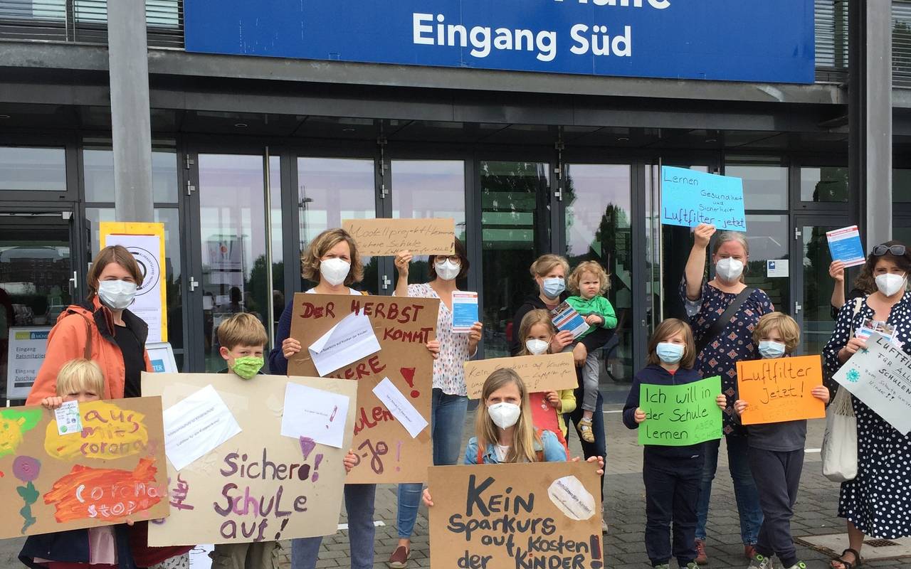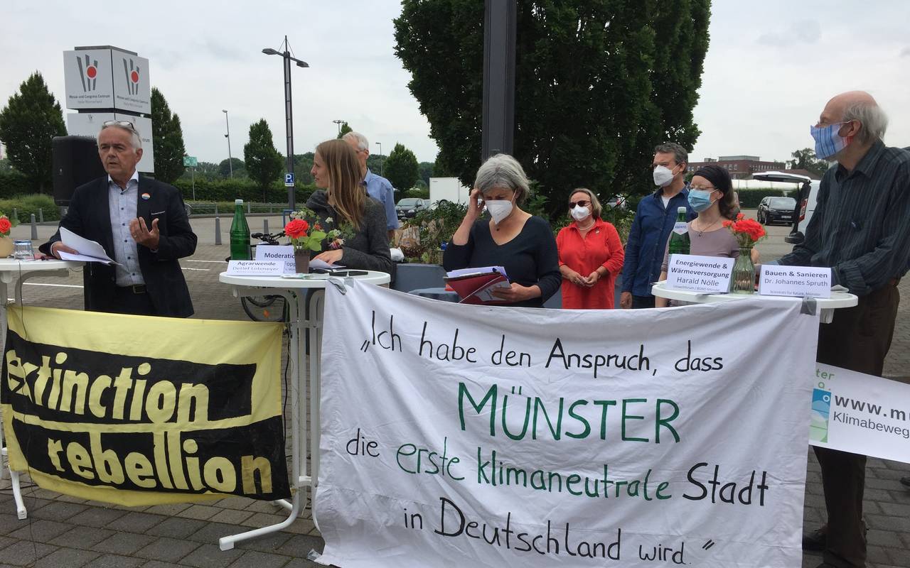 Schon in der Bürgerfragestunde zu Beginn der Ratssitzung sollen sich die Ratsmitglieder zur Frage äußern, ob Münster die erste klimaneutrale Stadt in Deutschland werden kann. Dieses Ziel hatte Oberbürgermeister Markus Lewe ausgerufen. Das Bündnis "KlimaEntscheid" erinnert daran mit einer Demo vor der Halle Münsterland (Foto).