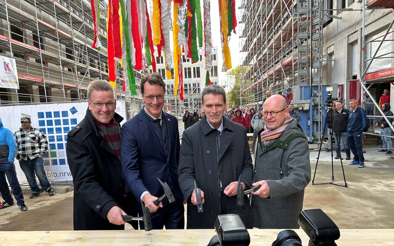 (Auf dem Foto oben beim Einschlagen der letzten Nägel (v.l.): Uni-Rektor Johannes Wessels, NRW-Ministerpräsident Hendrik Wüst, der Präsident der Fachhochschule, Frank Dellmann, sowie Münsters Oberbürgermeister Markus Lewe)