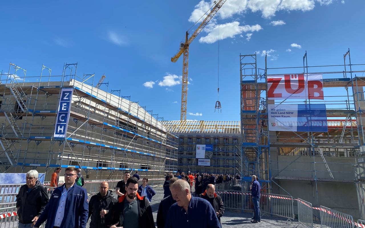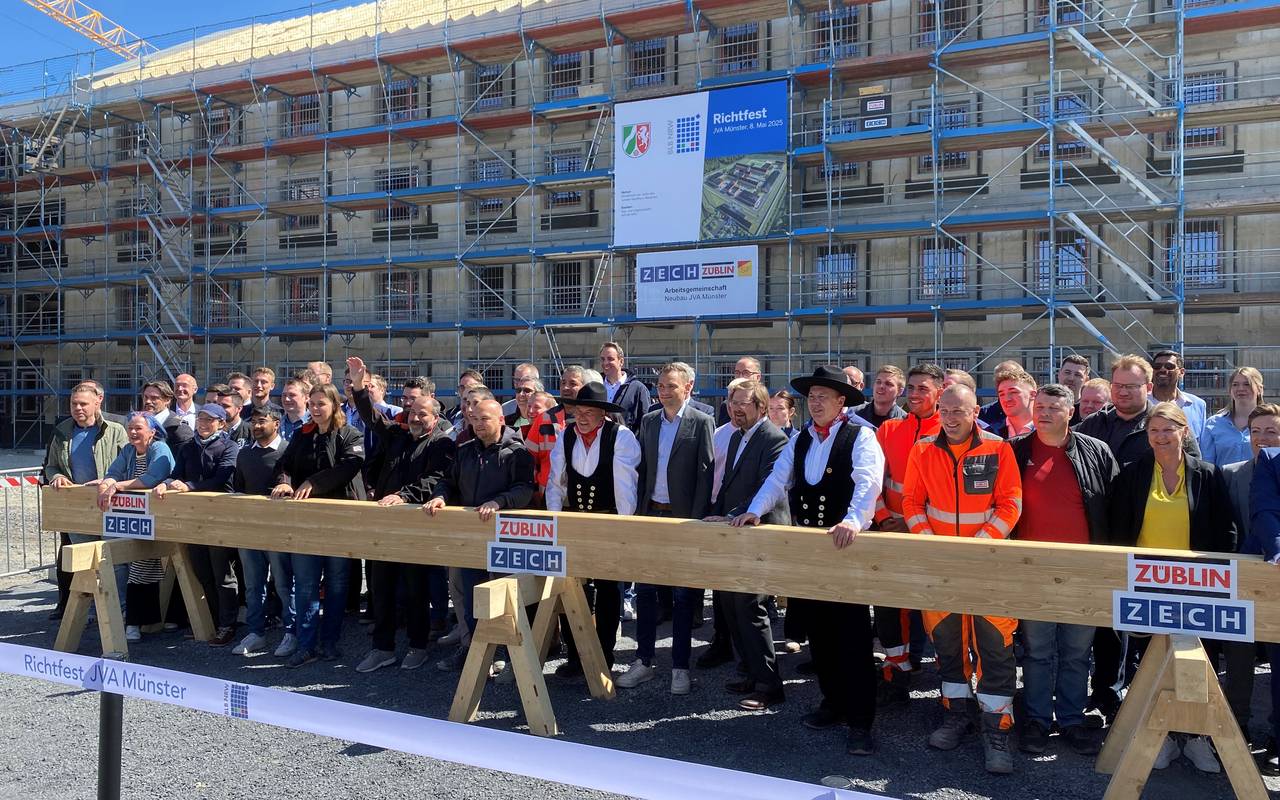 Der Neubau der Justizvollzugsanstalt Münster (JVA) hat ein weiteres wichtiges Etappenziel erreicht. Über dem Rohbau in Wolbeck hängt nun der Richtkranz.