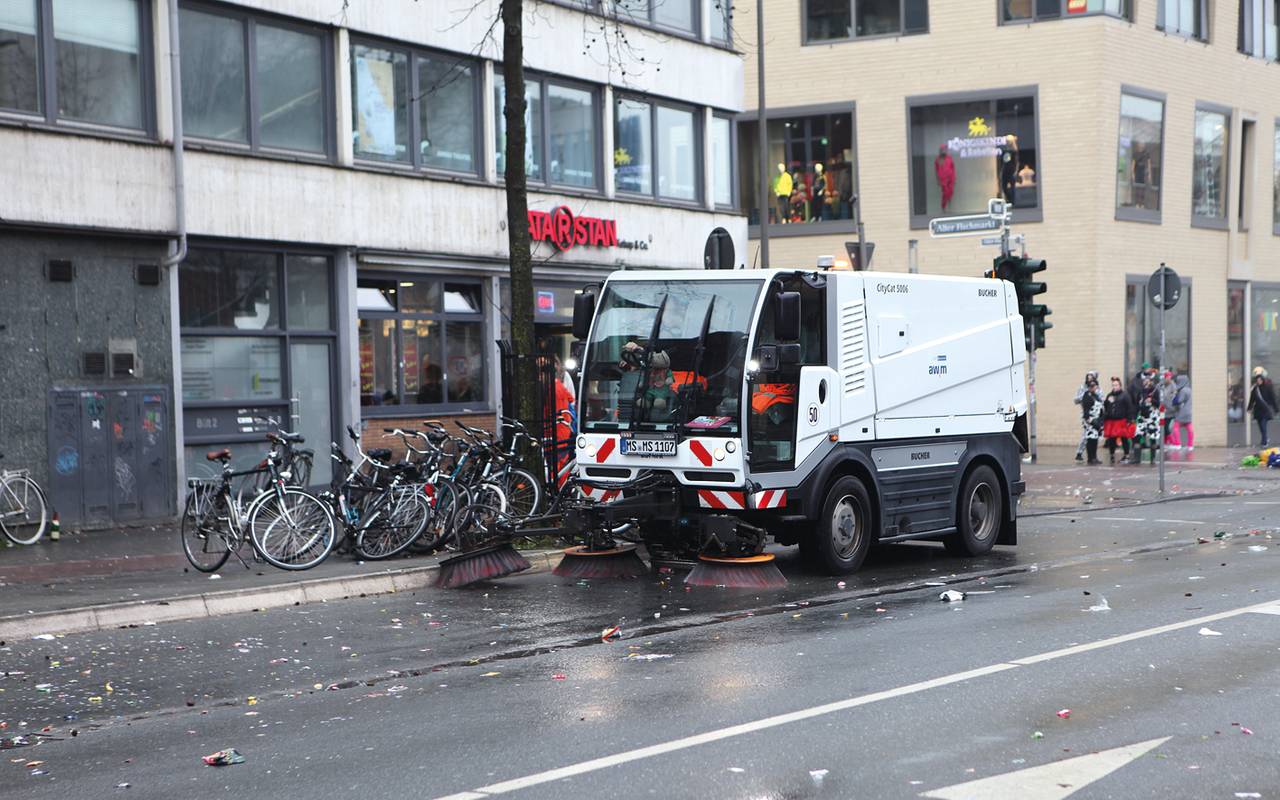 Bis 21 Uhr rollten am Rosenmontag (24.02.) sieben Groß- und vier Kleinkehrmaschinen der Abfallwirtschaftsbetriebe durch Münster. Mit zehn Mitarbeitenden waren die Teams in Orange zudem am Besen im Einsatz. "14 Tonnen Abfall wurden zusammengekehrt", bilanziert AWM-Sprecherin Manuela Feldkamp. "Das ist eine ähnliche Menge wie 2019. Aber aufgrund des Regens war das Abfallaufkommen durchnässt und wiegt entsprechend mehr."