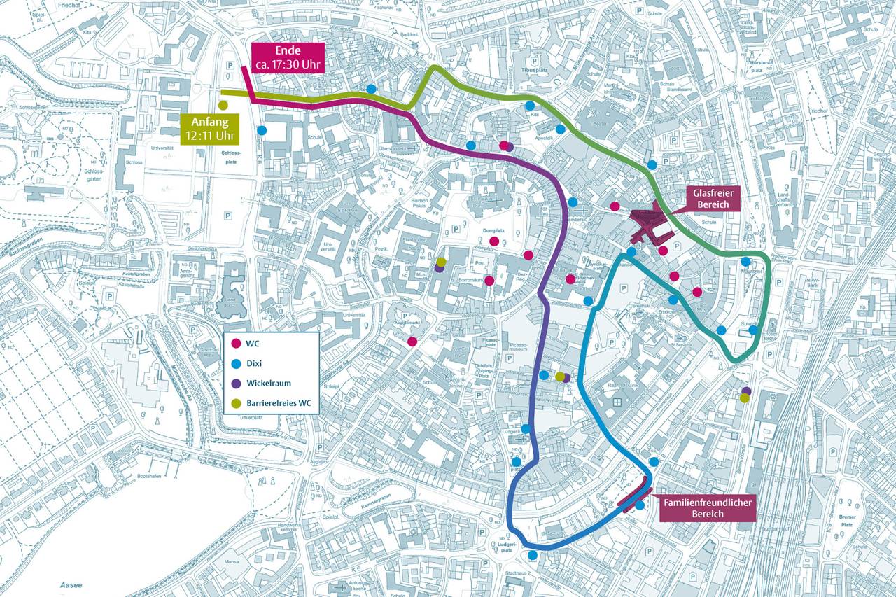 Die vier Kilometer lange Strecke ist am Schlossplatz gestartet und führte dann über die Überwasserstraße, die Bergstraße und den Bült bis zur Eisenbahnstraße. Dann bog der Umzug in die Salzstraße und führte über Stubengasse und Windthorststraße zurück zur Engelenschanze. Über die Ludgeristraße wurde dann der Prinzipalmarkt erreicht, ehe sich der Umzug dann an der Überwasserkirche vorbei zurück zum Schlossplatz bewegte.