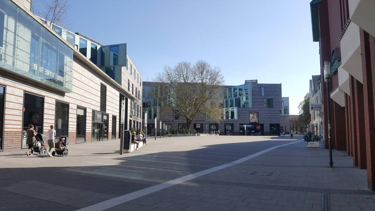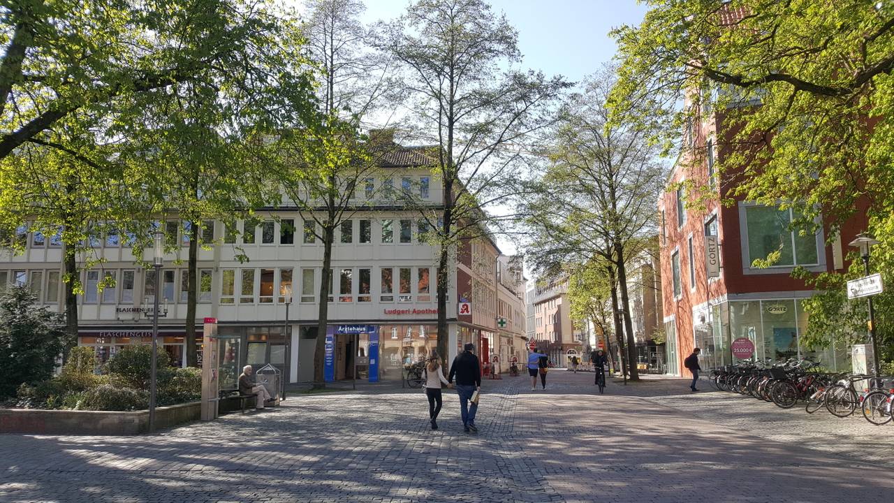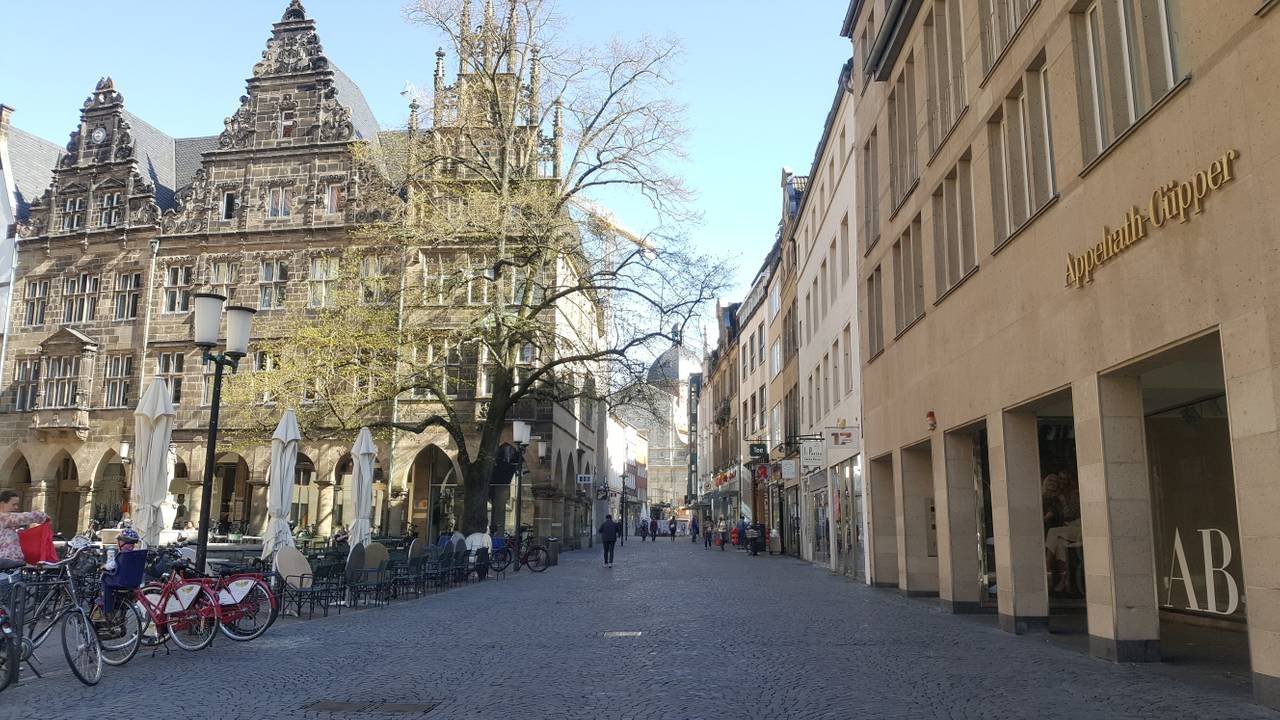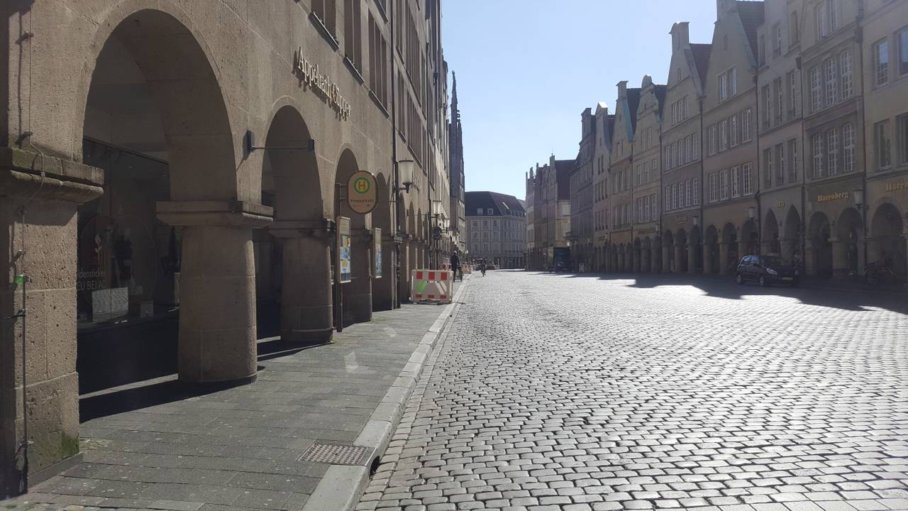 Eine fast menschenleere Stubengasse bei blauem Himmel und Sonnenschein - das sieht man nicht allzu häufig. Durch die Corona-bedingten Schließungen der Cafés und Läden der Innenstadt Münsters gleiche die Straßen dann doch einer Geisterstadt. Einzelne Spaziergänger und Menschen, die Besorgungen erledigen, sind zwar unterwegs, achten aber auf den Mindestabstand. Nur einzelne Hotspots scheinen für die aktuelle Situation gut besucht, wie die Grünstreifen an der Promenade und natürlich die Promenade selbst. Aber auch hier sitzen die Gruppen der Familien und WGs mit Abstand zueinander. Ein Stückchen Alltag ist in Münster eingekehrt.
