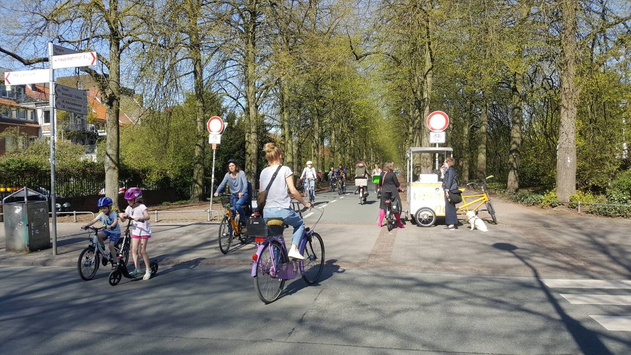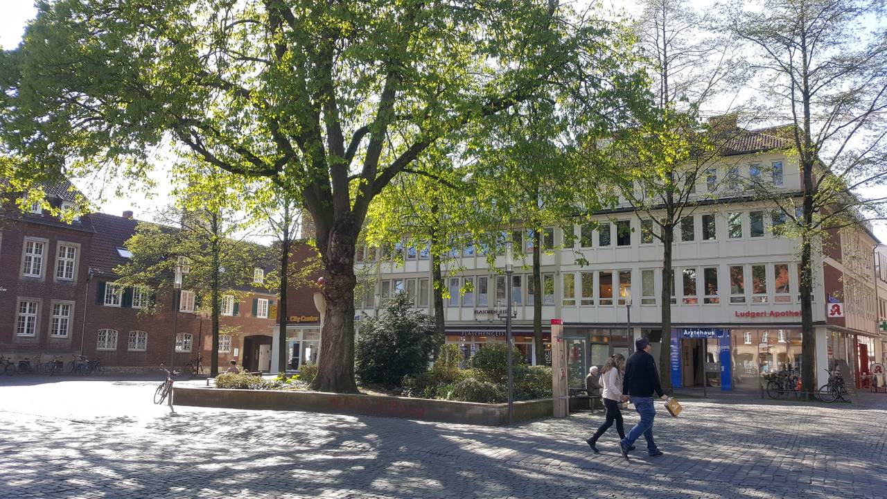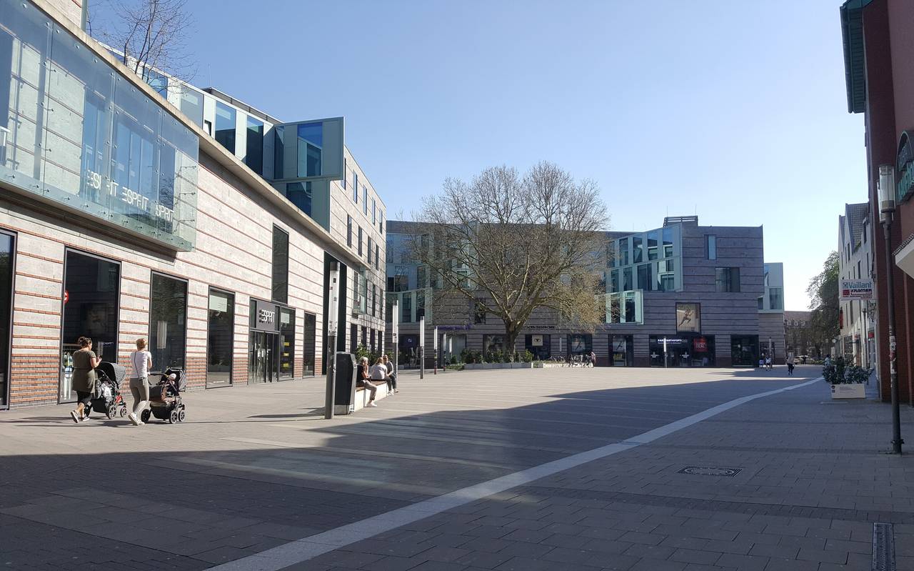 Eine fast menschenleere Stubengasse bei blauem Himmel und Sonnenschein - das sieht man nicht allzu häufig. Durch die Corona-bedingten Schließungen der Cafés und Läden der Innenstadt Münsters gleiche die Straßen dann doch einer Geisterstadt. Einzelne Spaziergänger und Menschen, die Besorgungen erledigen, sind zwar unterwegs, achten aber auf den Mindestabstand. Nur einzelne Hotspots scheinen für die aktuelle Situation gut besucht, wie die Grünstreifen an der Promenade und natürlich die Promenade selbst. Aber auch hier sitzen die Gruppen der Familien und WGs mit Abstand zueinander. Ein Stückchen Alltag ist in Münster eingekehrt.