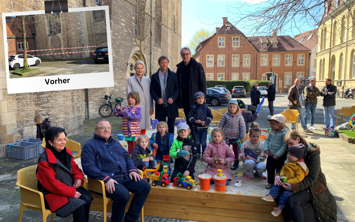 Aus einem öden Parkplatz ist ein neuer Treffpunkt für Familien und Innenstadtbesucher geworden. Am Eingang der Ludgeristraße zur Innenstadt - an der Ludgerikirche - gibt es seit kurzem einen großen Sandkasten für die Kinder und drum herum 15 bequeme Stühle, auf denen man sich zum Ausruhen oder Plauschen treffen kann. Das Konzept dahinter: Den Menschen Wohlfühl-Orte in der Stadt zurückgeben und die Innenstadt ein Stück autofreier zu machen.