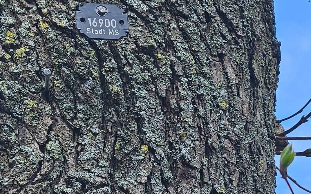 Immer wieder müssen städtische Mitarbeiter:innen Bäume an Münsters Straßen pflegen. Ziel ist es, dass sie keine Gefahr für vorbeifahrende Autos, Busse oder Radfahrer sind. Auffällig sind dabei in die Baumrinde genagelte Schildchen - ANTENNE MÜNSTER-Hörer:innen fragen nach dem genauen Zweck der Schilder. Sie sollen dabei helfen, die Bäume eindeutig zu identifizieren. Auf ihnen steht eine fünfstellige Zahl und dann die Aufschrift "Stadt MS". Jeder Baum hat also nun eine eigene Nummer. Und wenn es an den Bäumen was zu tun gibt, beispielsweise Äste absägen oder den Baum sichern, dann erhalten die Helfer:innen nur noch die Nummer und wissen, an welchem Baum der Arbeitsauftrag stattfindet.