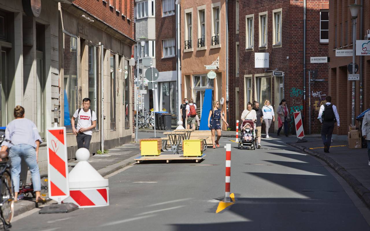 Mit diesem achtwöchigen Versuch möchte die Stadt bis zum 24. September ausprobieren, welche Auswirkungen es hat, wenn in der schmalen Straße keine Busse mehr fahren, keine Autos mehr parken und es keinen Durchgangsverkehr mehr gibt. Das Ziel: ein temporäres Zukunftsbild skizzieren, in dem es weniger Verkehr, Lärm und Schadstoffbelastung, dafür mehr Lebens- und Aufenthaltsqualität gibt. Für den motorisierten Durchgangsverkehr ist die Straße gesperrt - eine komplett autofreie Zone von der Steingasse bis zur Tiefgarageneinfahrt Hörsterstraße. Fahrräder haben freie Fahrt in beide Richtungen und mit rund 40 zusätzlichen Fahrradständern auch mehr Abstellmöglichkeiten. Ein Fahrradrikscha-Shuttle pendelt zwischen den Bushaltestellen am Hörstertor und dem Bült.
