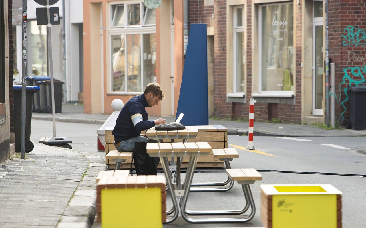 Ein Teil des Mobiliars stellt das Zukunftsnetzwerk Mobilität NRW kostenfrei zur Verfügung, ein Teil der Sitzmöbel kommt von lokalen Partnern – unter anderem der Trafostation.