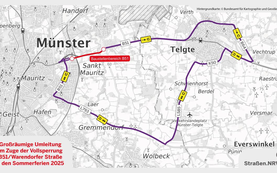 Für den überörtlichen Verkehr ist eine Umleitungsstrecke über die Wolbecker Straße (L793), L585 und K50 in Richtung Telgte zur B64 eingerichtet - jeweils in beide Fahrtrichtungen. Zusätzlich ist erneut die bewährte Rotpunkt-Umleitung über den Albersloher Weg (L586) und die Umgehungsstraße Wolbeck (L585) ausgeschildert. Für den Verkehr von der A43 und A1 wird eine großräumige Umleitungsempfehlung über die AS Greven ausgewiesen. Die B51 ist vom Knotenpunkt Handorf aus in Richtung Münster nur für den direkten Anliegerverkehr bis zur Baustelle befahrbar. Die Durchfahrt für Radfahrende, Linienbusse und Rettungsdienste bleibt jederzeit gewährleistet.