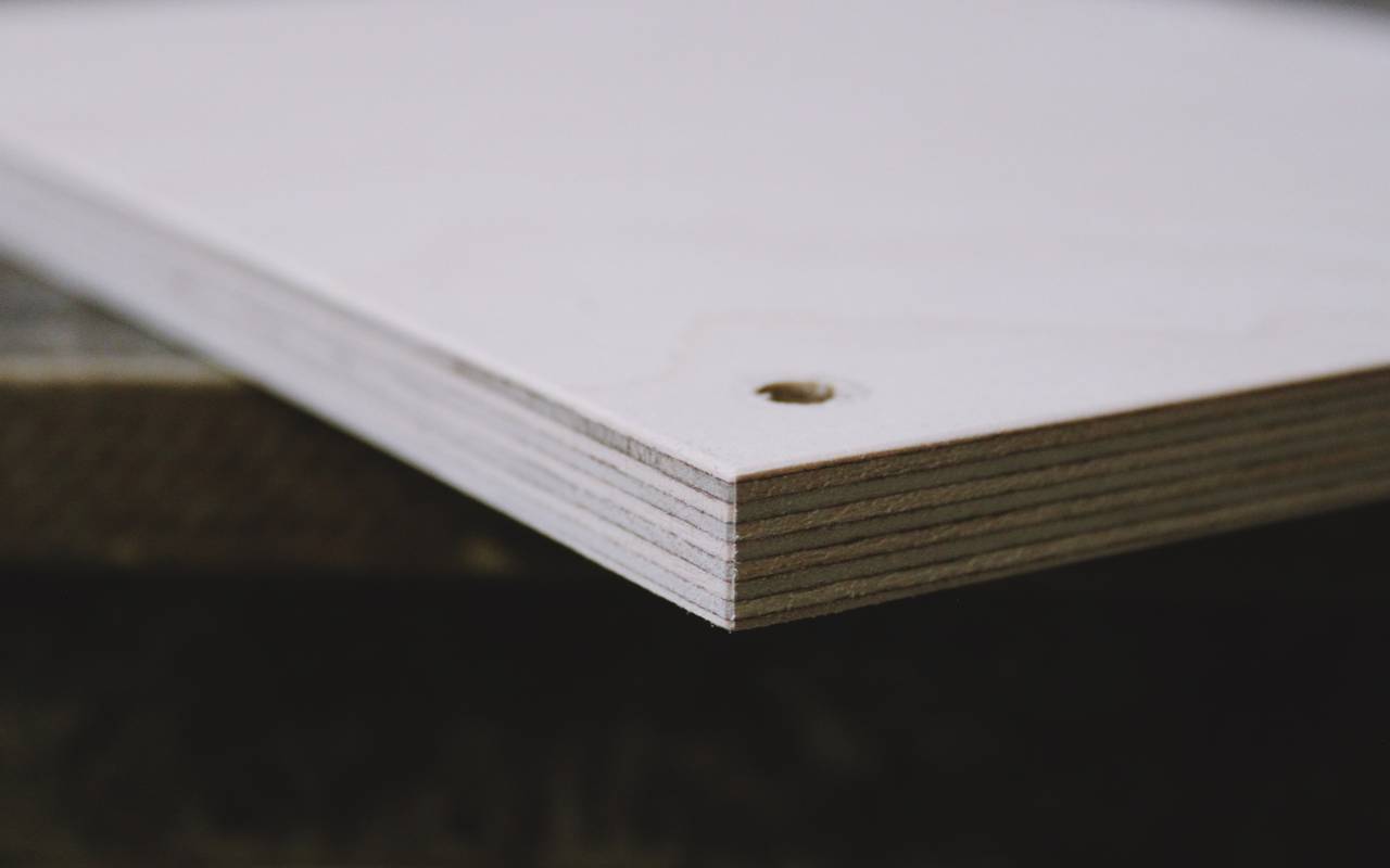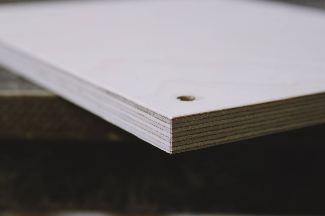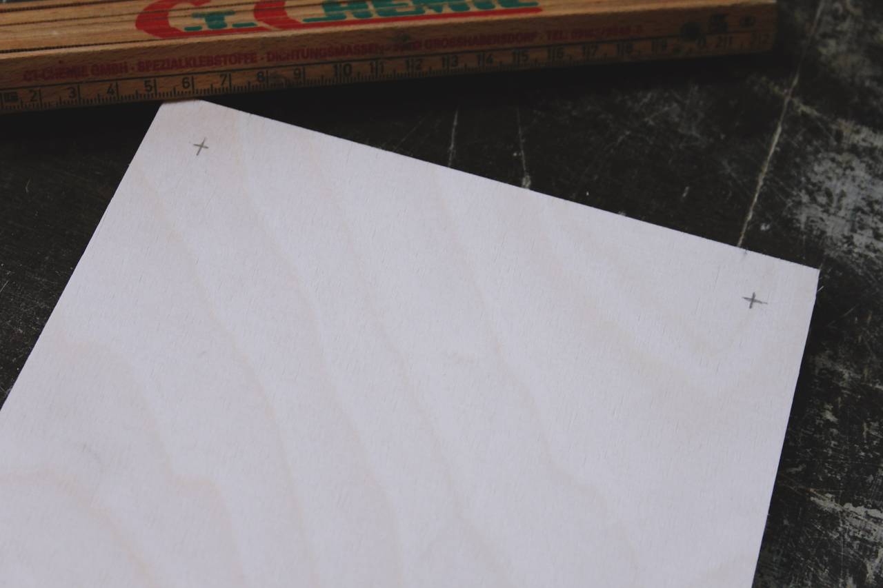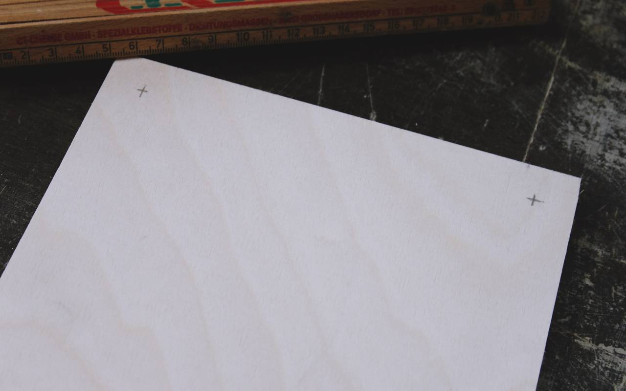 Wir bohren zuerst die vier Löcher in die Platten. Dafür markierst du dir auf der schöneren der beiden Flächen (das wird der Deckel) die Position. Die Schrauben sollten nicht zu weit außen liegen. Eine gute Position ist etwa 15 mm von beiden Randseiten entfernt.
