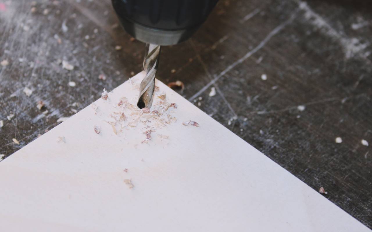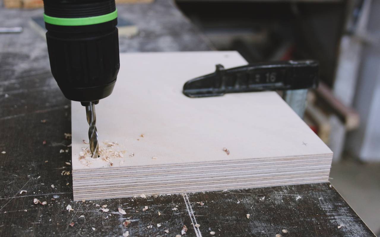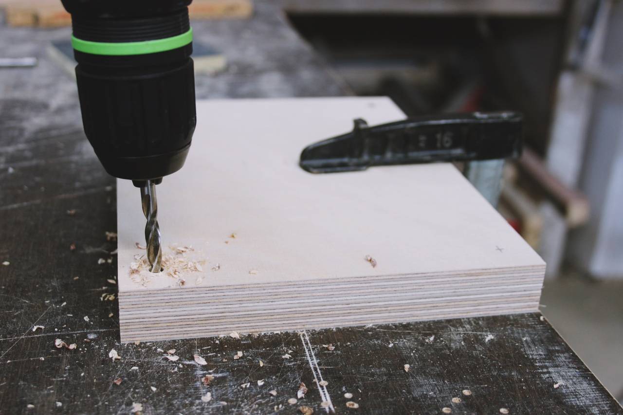 Dann legst du die beiden Platten genau aufeinander, so, wie sie später liegen werden (den Deckel also mit der Oberseite nach oben auf die Innenseite des Bodens legen). Zwinge sie übereinander auf der Werkbank fest und prüfe, ob alle Kanten bündig sind. Mit dem 6er Bohrer bohre ich dann ein durchgehendes Loch mittig durch die vier ersten Löcher. Achte darauf, dass du den Bohrer dabei gerade hältst.