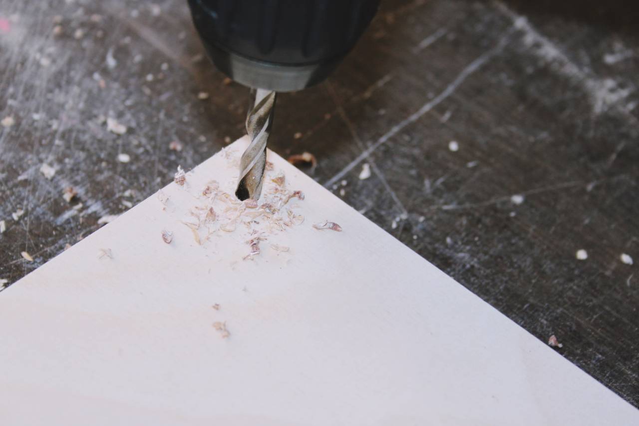 Mit dem 7er Bohrer bohrst du dann and den vier Ecken durch den Deckel hindurch. Wenn du an einem Tisch arbeitest, der nicht zum Werken gedacht ist, leg unbedingt ein Holzbrett unter, das du nicht mehr braucht, sonst bohrst du dir gleich Löcher in die Tischplatte. Bohre nicht durch die Platte „in die Luft“ hinein, dadurch entstehen ziemlich unschöne Ausrisse auf der Unterseite!