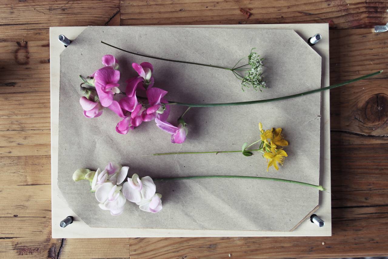 Bevor du die Blumen dann in die Presse legst, trockne die Stiele gründlich ab, damit sie nicht schimmeln. Die Blumen sollten sich nicht berühren, außer du magst ein zusammenhängendes Bild erstellen – sobald sie trocken sind, kannst du sie nämlich nicht mehr lösen.