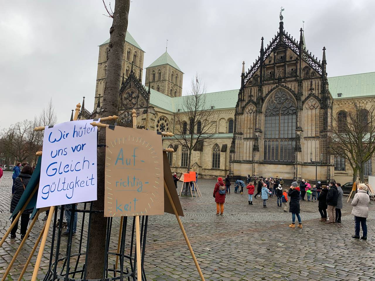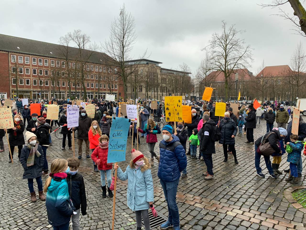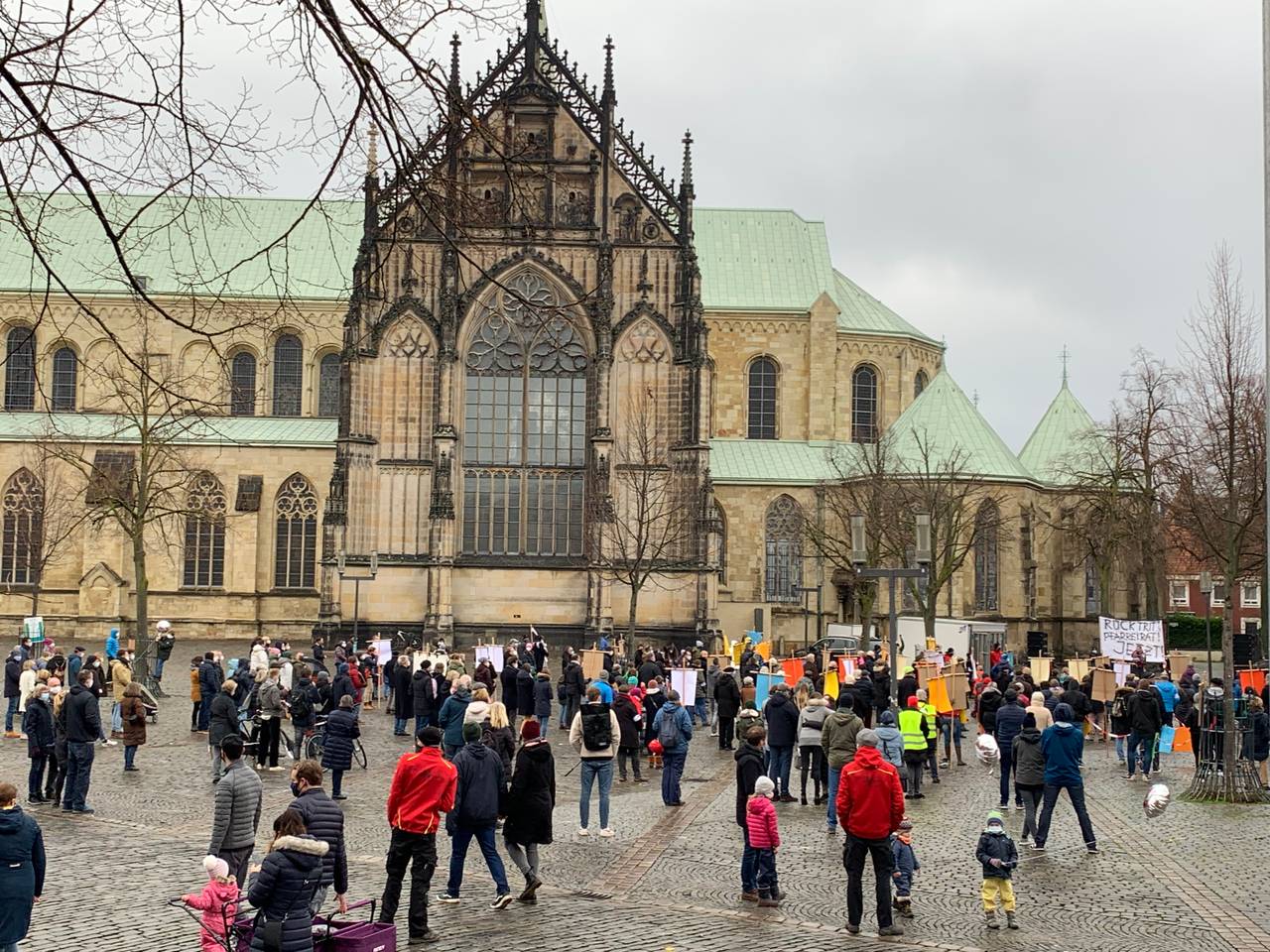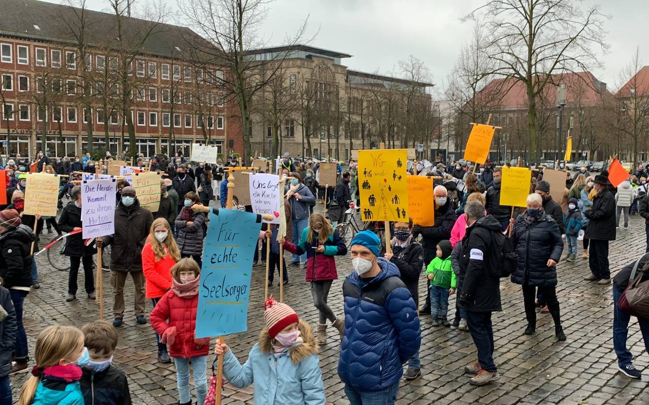 Trotz der Corona-Pandemie haben sich zahlreiche Gemeindemitglieder am Sonntag auf dem Domplatz versammelt. Ihr Anliegen sei "zu wichtig" und müsse "gehört werden", hieß es von den Mitgliedern der Gemeinde gegenüber ANTENNE MÜNSTER. Man wünsche sich einen "offenen Dialog auf Augenhöhe", endlich "Transparenz" und "Gesprächsbereitschaft" seitens des Bistums. Einige Gemeindemitglieder äußerten sogar Zweifel an einer weiteren Mitgliedschaft in der katholischen Kirche. Die gut zweieinhalbstündige Demonstration verlief friedlich, fast andächtig; die Wut, Hilflosigkeit und die Enttäuschung waren aber dennoch deutlich zu spüren. Die nötigen Corona-Abstände wurden durch Markierungen auf dem Boden eingehalten. Gesungen wurde aufgrund der verschärften Pandemielage nicht.