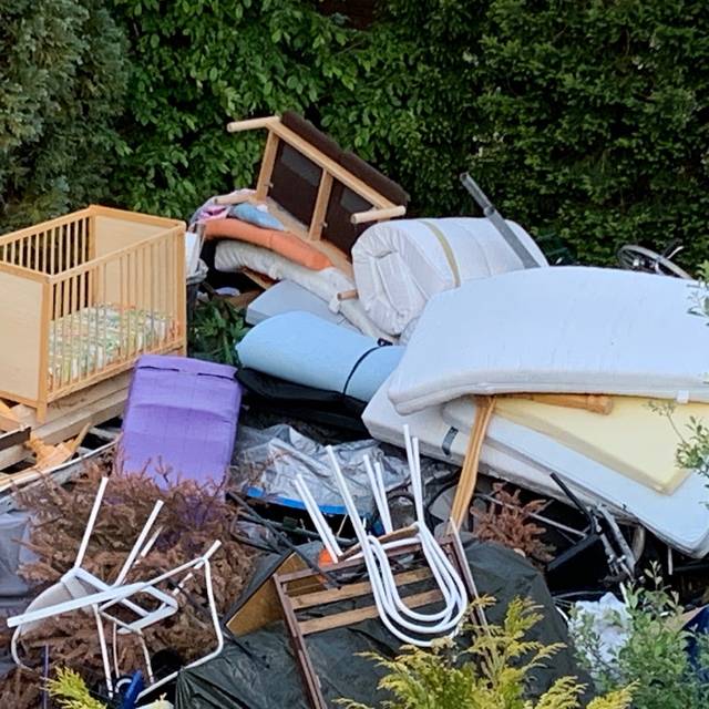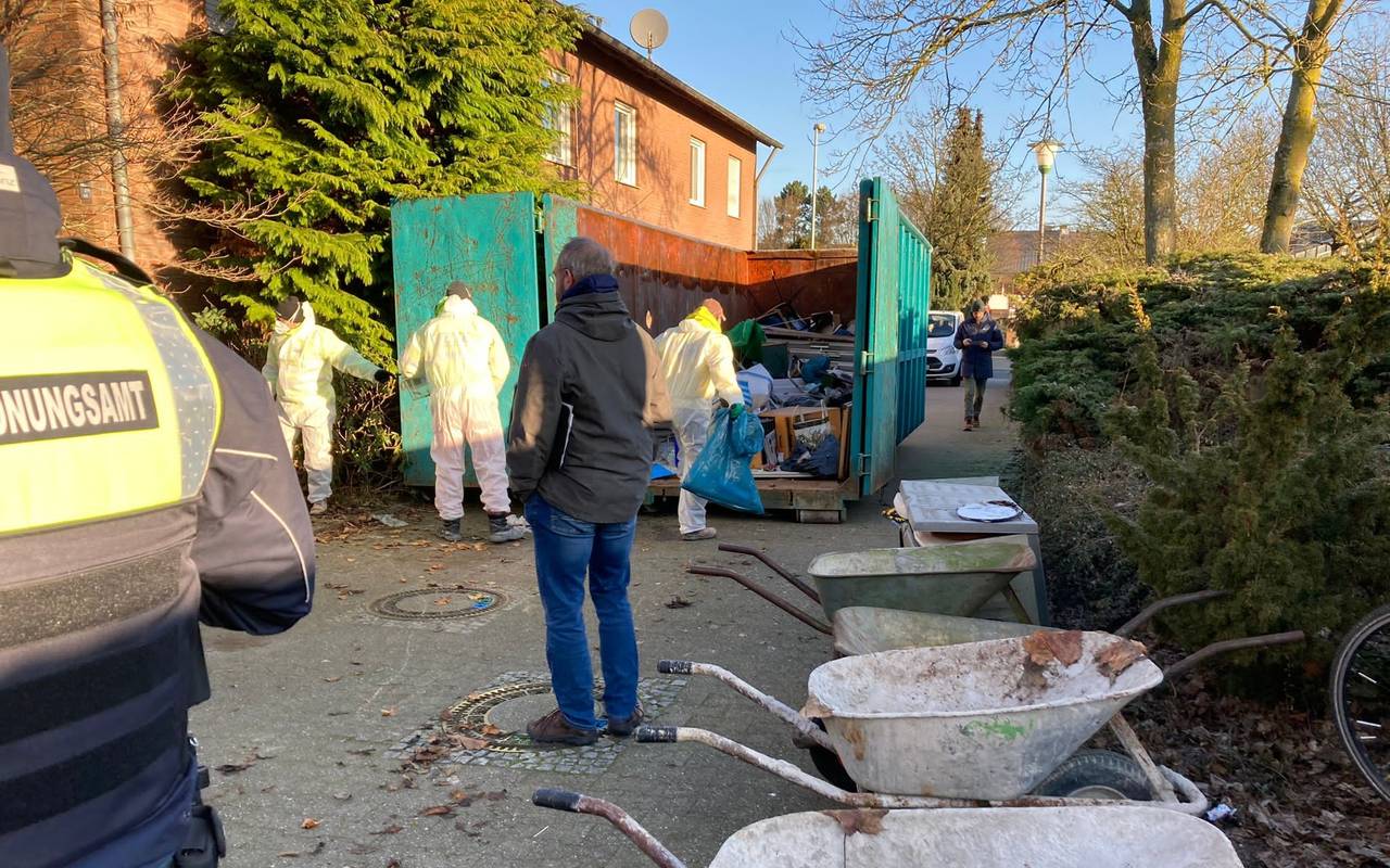 Helfer entrümpeln in diesem Augenblick das Grundstück des Müllsammlers von Kinderhaus. Sie räumen alles in einen großen Container.