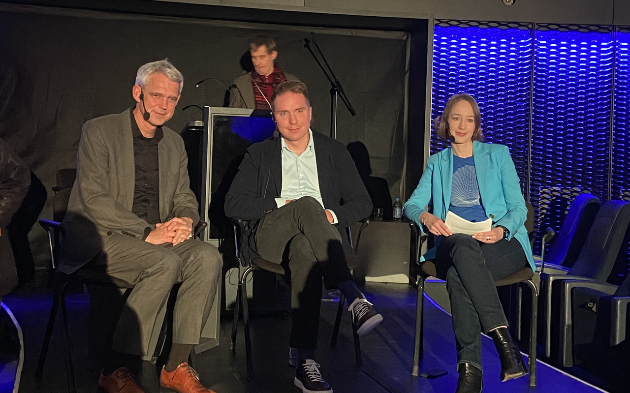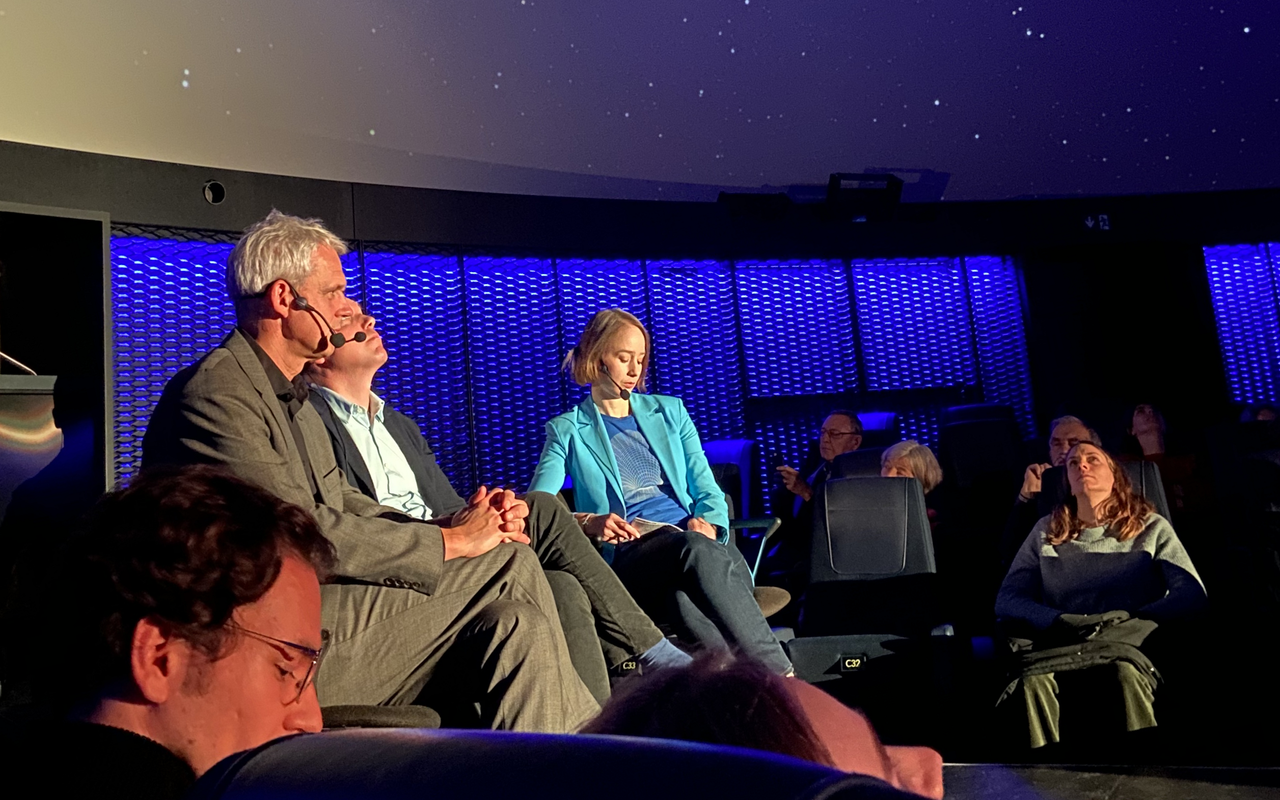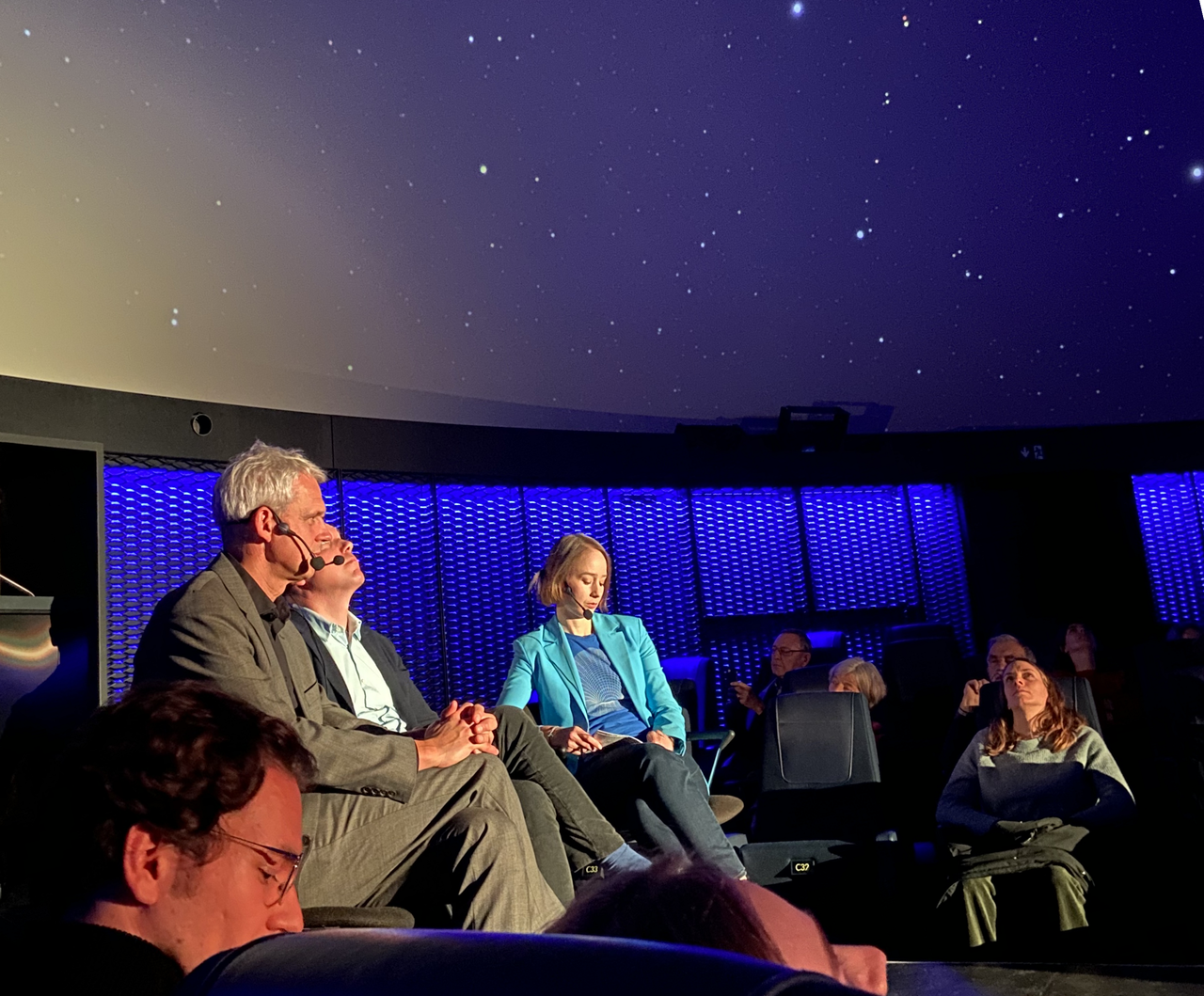 Physik für Anfänger:innen ist wahrscheinlich die beste Beschreibung für das Event am Abend im Planetarium Münster. Die Zutaten: Etwas physikalischen Input, unter anderem mit Erklärungen einer physikalischen Theorie mithilfe von Socken. Und zwischendrin immer wieder die Geschichten von Timothy Hawking – genannt „Tim“ (siehe obiges Foto, in der Mitte). Er erzählte über das Monopoly-Spielen mit seinem Vater Stephen Hawking, einen der berühmtesten Wissenschaftler aller Zeiten. Oder, wie sein Vater ihm bei den Mathehausaufgaben half.