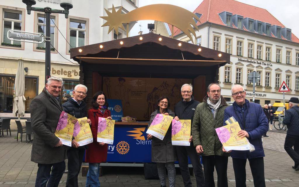 Seit Dienstag (26.11.) hat wieder die "Sternstrahlen"-Hütte der Rotarier in Münster am Drubbel für euch geöffnet. Dort könnt ihr für einen guten Zweck Weihnachtskarten und Geschenkpapier kaufen. Das Geld geht im Rahmen unserer Aktion "Lichtblicke" an Projekte für Kinder und Jugendliche, die in armen Verhältnissen leben.
