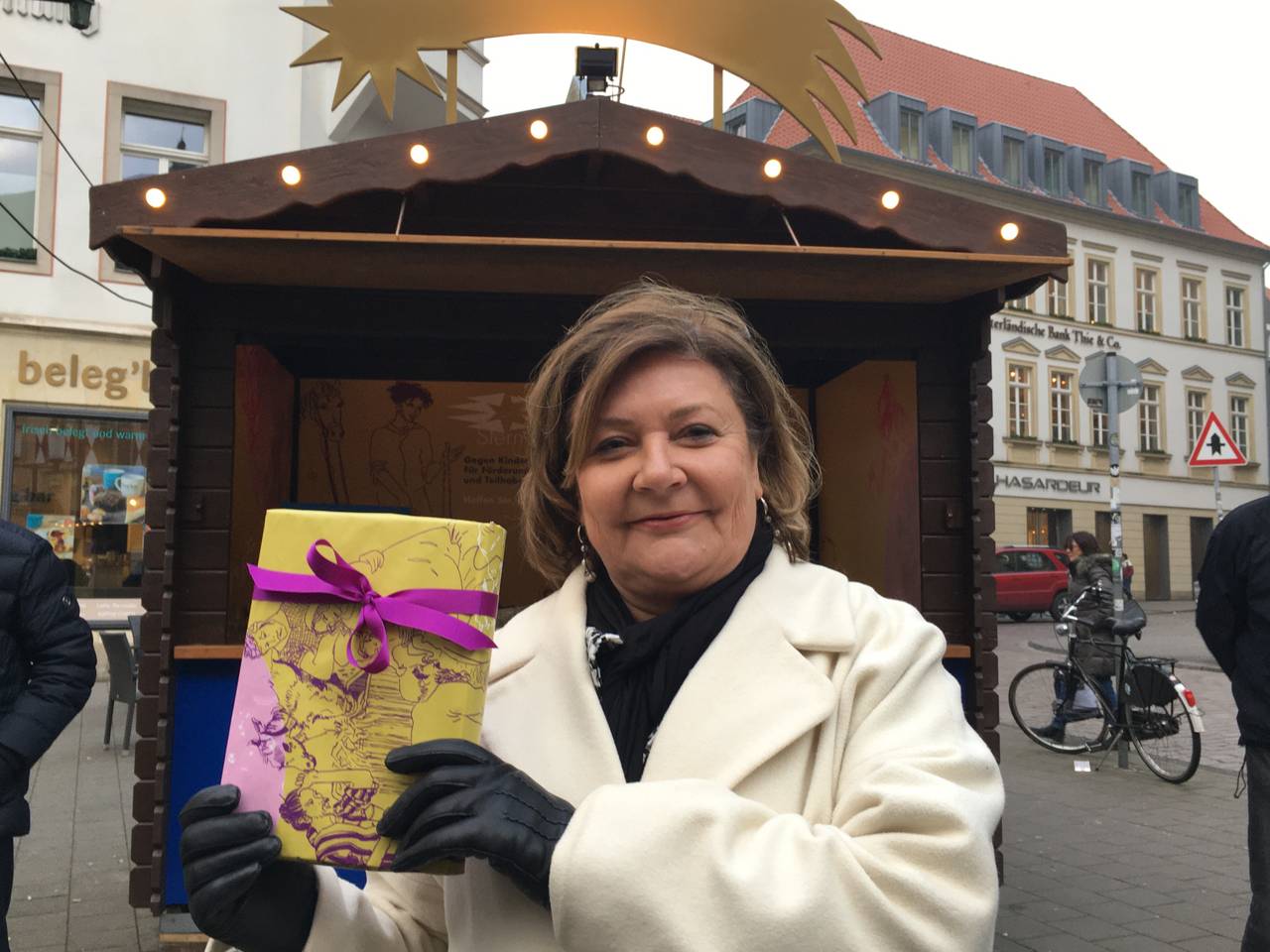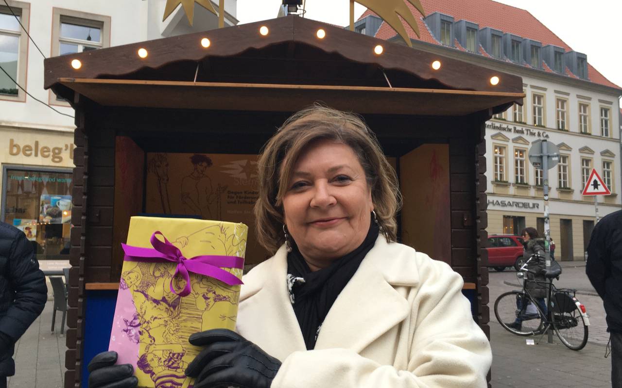 Die Weihnachtskarten oder das Geschenkpapier kosten 5 Euro und haben seit einigen Jahren immer ein spezielles Märchenmotiv. Das diesjährige Kartenmotiv stammt wieder von der Künstlerin Silke Rehberg. "Der Mond" ist ein weniger bekanntes Märchen aus der Sammlung der Brüder Grimm und zeigt auf, wie etwas, das allen gehört, durch Egoismus nach und nach seinen Wert verliert. Der münstersche Schriftsteller Burkhard Spinnen treibt dieses Märchen in einem kleinen Sonderdruck (am Sternstrahlen-Stand als Zugabe zu Karten und Weihnachtspapier erhältlich) auf die zeitgenössische Spitze. Er stellt dem Märchen ein "Update" gegenüber, in dem der Egoismus sogar die Außengastronomie in Münster (und anderswo) in Frage stellt.