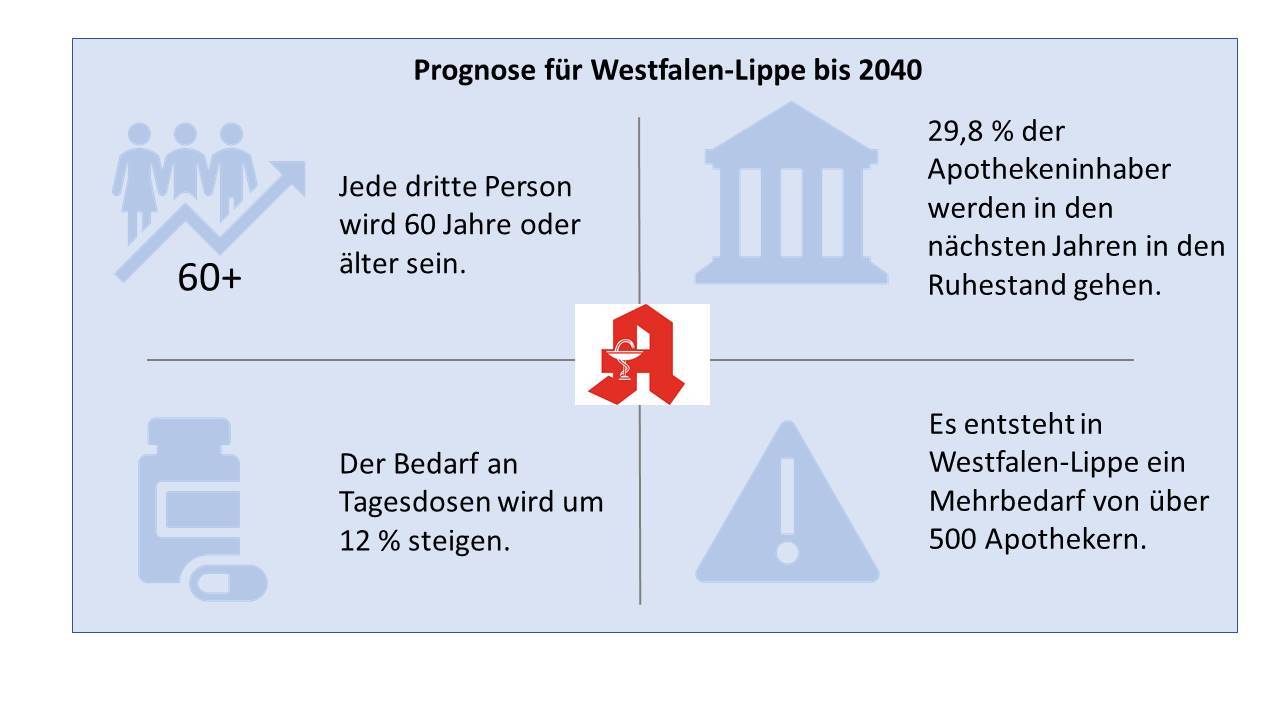 So ist in Westfalen-Lippe annähernd jeder dritte Apothekeninhaber derzeit 60 Jahre und älter. Die Anzahl der Bürger 65+ wird in NRW um 1,25 Millionen zunehmen. Dies entspricht einem Anstieg von 33 Prozent. Eine Apotheke in Westfalen-Lippe wird folglich im Jahr 2040 durchschnittlich 257 ältere Patienten mehr zu versorgen haben. Weil mit dem Alter die Wahrscheinlichkeit steigt, an mehreren Erkrankungen zu leiden und auf mehrere Arzneimittel angewiesen zu sein, nimmt der Arzneimittelbedarf deutlich zu: Die Zahl der Arzneimittel-Tagesdosen wird der IAT-Studie zufolge bis zum Jahr 2040 in der Region um 500 Millionen ansteigen, das entspricht einem Plus von 12 Prozent. Damit wird auch der Bedarf an pharmazeutischer Beratung und zusätzlichen Dienstleistungen größer. Um das aktuelle Versorgungsniveau zu halten, werden in allen Städten und Landkreisen zusätzliche Apotheker gebraucht. Der IAT-Studie zufolge 500 in ganz Westfalen-Lippe. Zudem müssen Apotheker ersetzt werden, die in den kommenden Jahren Ruhestand treten.