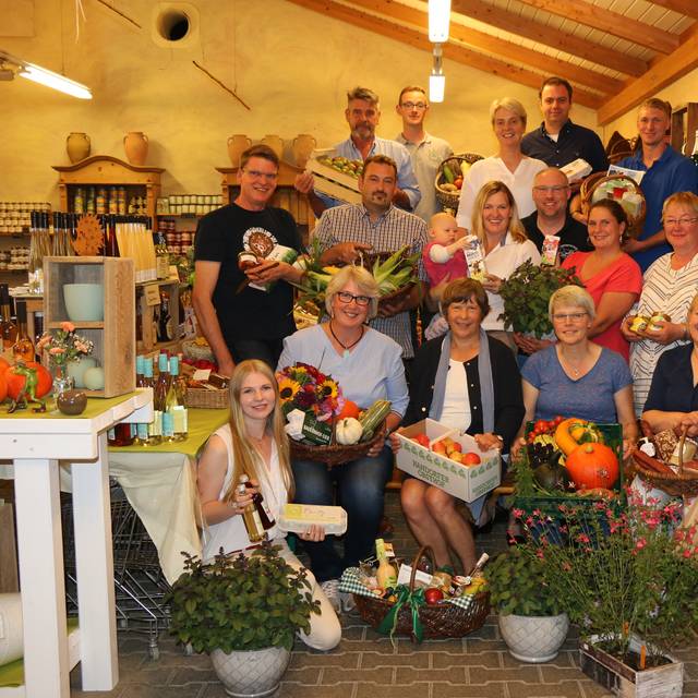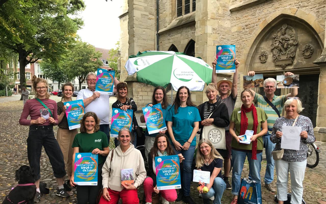 Sie sind bei den Tagen der Nachhaltigkeit dabei (v.l.n.r): Anni Lienemann (Wilde Rauke e.V.), Dr. Leandra Praetzel (Münster nachhaltig e.V.), Victoria Schulze Buschhoff (ökullus), Gordon Liermann (Tauschring Lowi e.V.), Kerstin Ramsauer (Münster nachhaltig e.V.), Dirten von Schmeling (Gärtnerhof Entrup 119), Kerstin Bormann (Weltladen la tienda e.V. & Netzwerk Kritische Stadtrundgänge), Julia Ebert (Fachstelle Nachhaltigkeit im Amt für Grünflächen, Umwelt und Nachhaltigkeit der Stadt Münster), Annalena Brix (Gemeinwohlökonomie Münsterland & Drubbel e.V.), Ute Wichelhaus (Biologische Station Rieselfelder), Theresa Bauer (elben), Henning Kraken (Wassertanke), Dr. Sigunde Kussek (Stadtbücherei Münster), Reinhard Wessling (Waldschutzgruppe Münsterland), Angelika Wegert-Ladleif (Omas gegen Rechts)