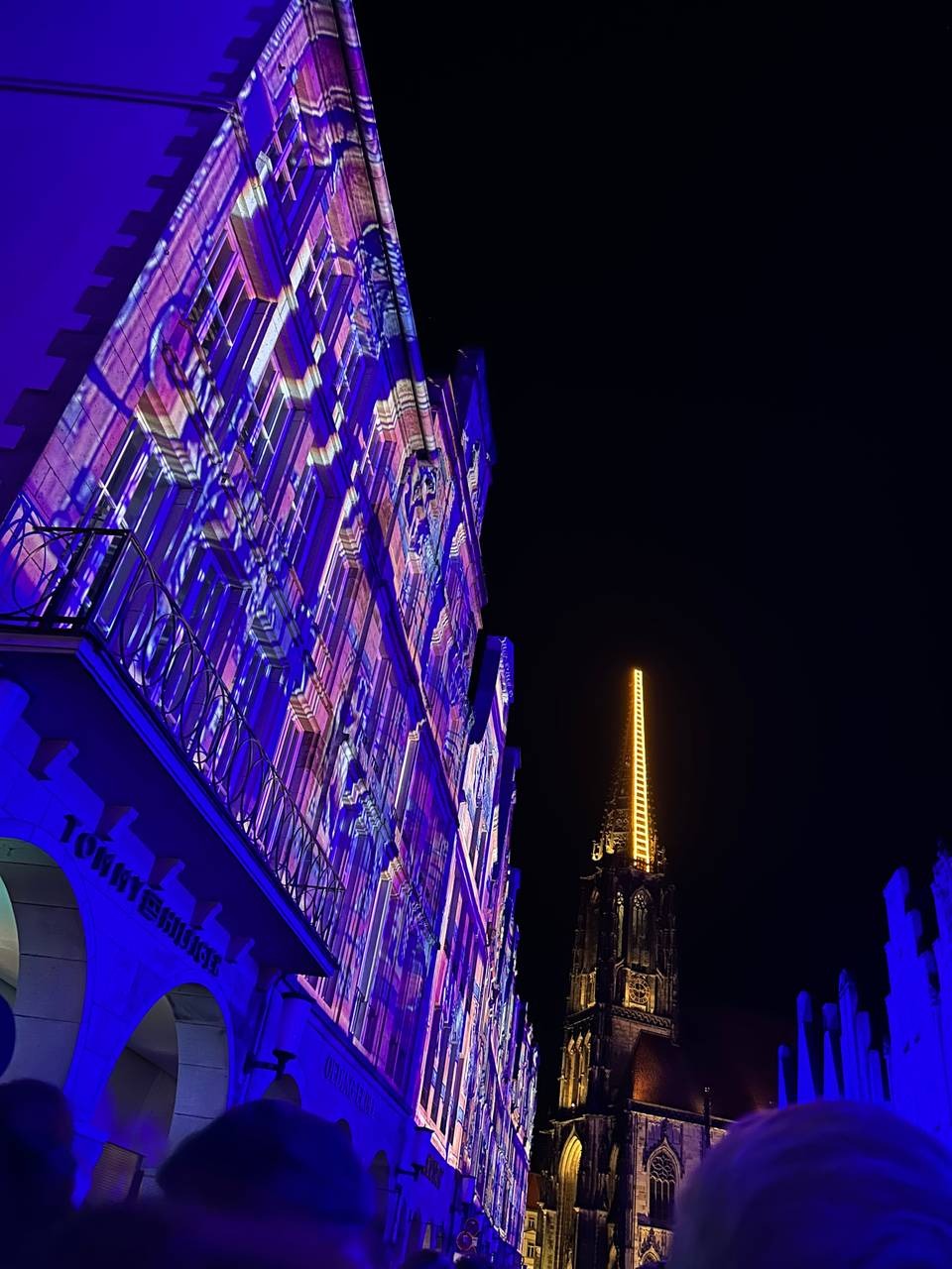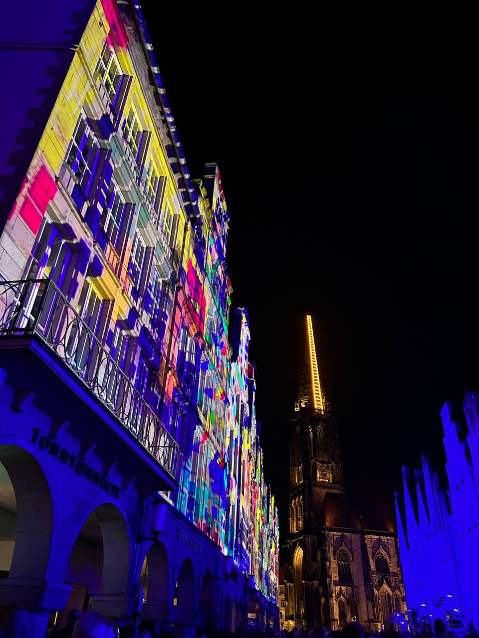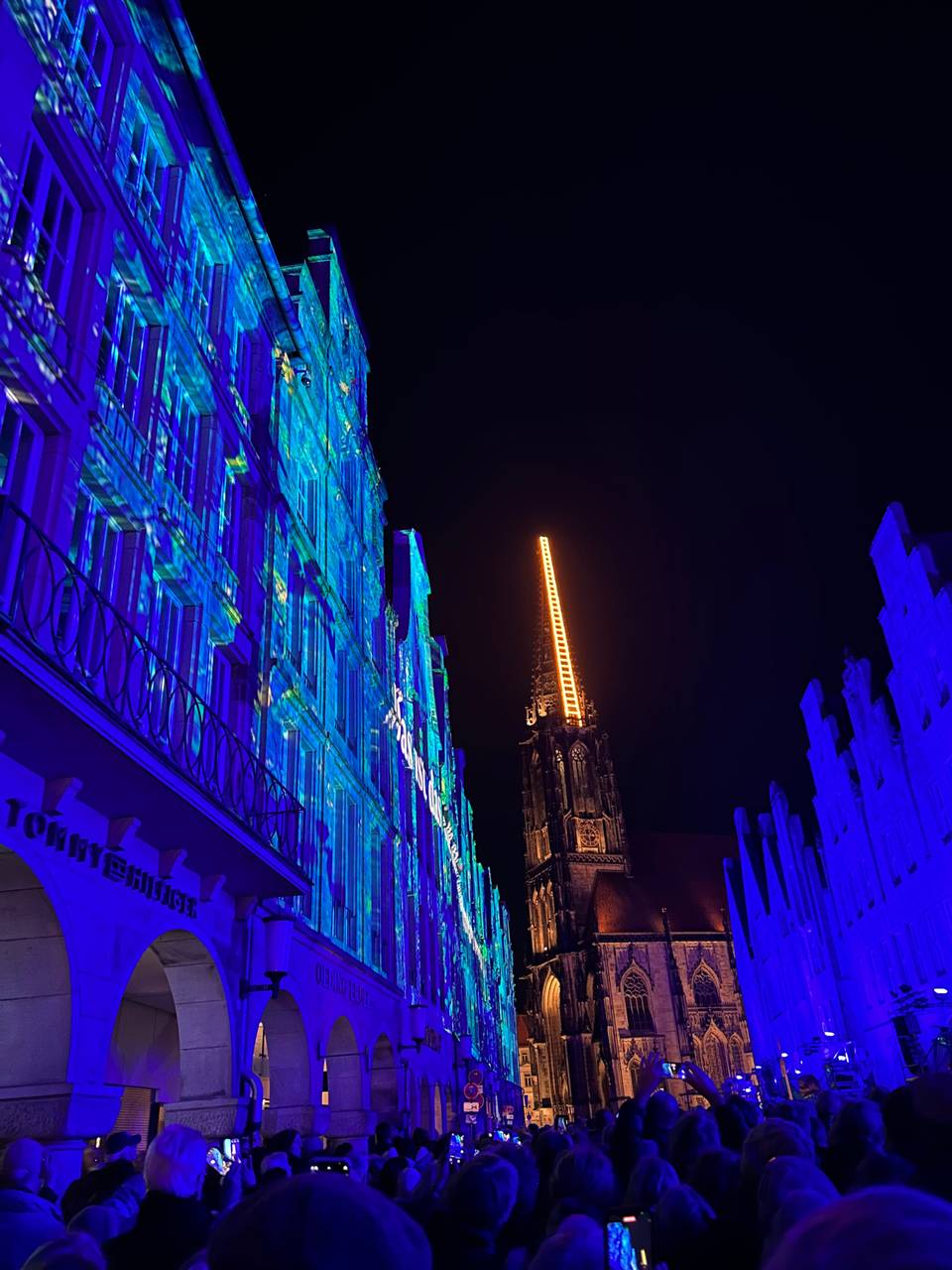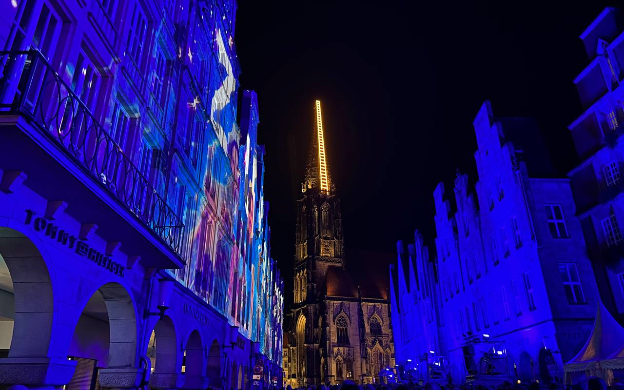 Die Lichter-Installationen hatte der bekannte Lichtkünstler Michael Batz entwickelt. Batz verwandelt in seiner Wahlheimat Hamburg alle zwei Jahre den dortigen Hafen mit Speicherstadt und Elbphilharmonie mit seinen blauen Licht-Effekten in einen zauberhaften "Blue Port". Zudem hatte Fritz Schmücker, den viele Münsteraner:innen als künstlerischen Leiter des Internationalen Jazzfestivals in Münster kennen, ein hochkarätiges Musik-Ensemble für die Sounds der Open-Air-Inszenierung zusammengestellt - unter Leitung des Wiener Komponisten und Drehleiher-Spielers Matthias Loibner. Anlass der 45-minütigen Performance: Am 24. Oktober vor 375 Jahren wurde in Münster und Osnabrück Frieden nach dem Dreißigjährigen Krieg geschlossen. Der Tag bildete zugleich den Abschluss des Jubiläumsjahres in Münster.