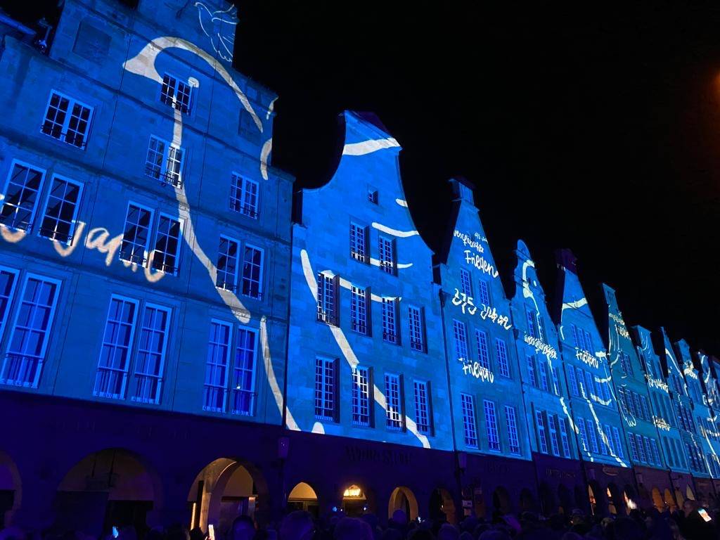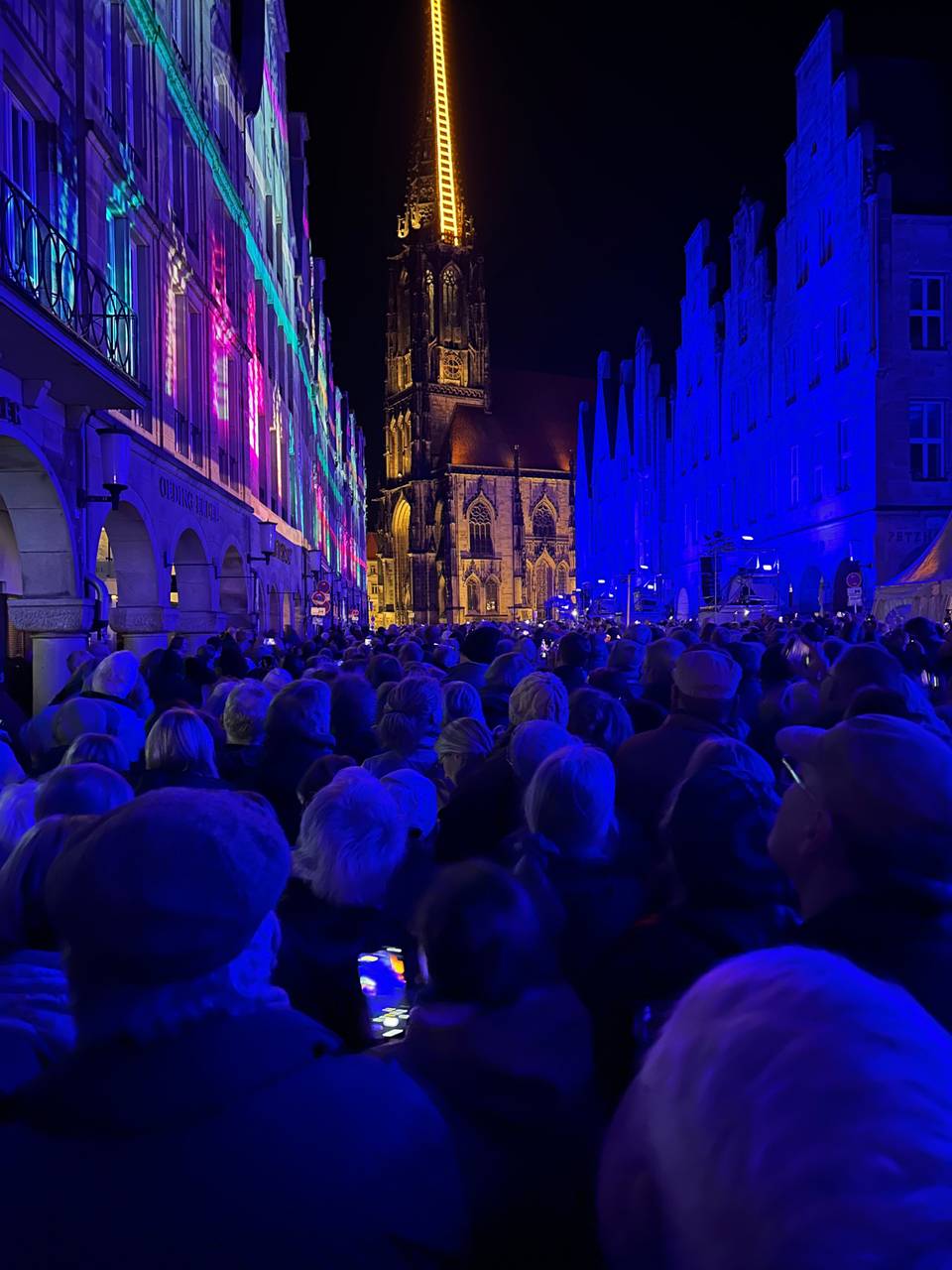 Knapp 10.000 Menschen haben sich am Abend auf dem Prinzipalmarkt versammelt, um die Lichtinstallation "Longing for Peace" zu sehen.