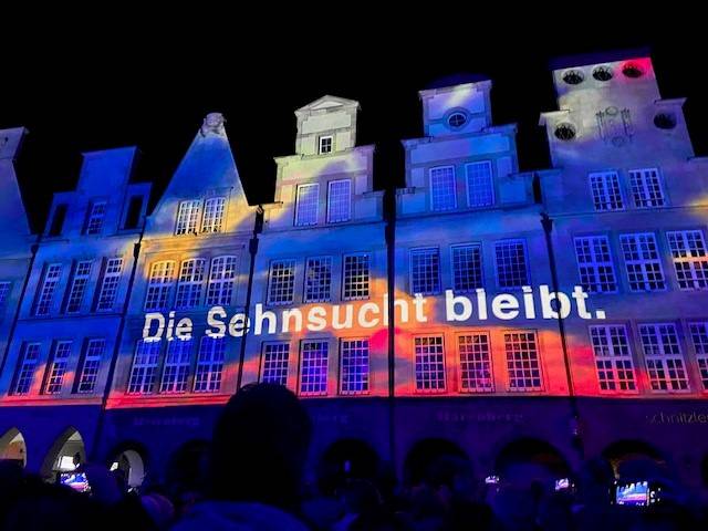 Es war einfach kein Durchkommen mehr. Dicht an dicht gedrängt standen Münsteranerinnen und Münsteraner am Abend auf dem Prinzipalmarkt, um die Lichtinstallation "Longing for Peace" zum Abschluss des Friedensjahres in unserer Stadt zu sehen. Der Hamburger Lichtkünstler Michael Batz ("blue port") zauberte dabei Lichtsequenzen und Friedensbotschaften auf die Fassaden der Giebelhäuser. Wohl kaum eine oder einer, der danach nicht 20 oder 30 Fotos und Videos auf seinem Handy gespeichert hatte. "Emotional und beeindruckend", so eine von vielen begeisterten Zuschauerinnen und Zuschauern im Gespräch mit ANTENNE MÜNSTER.