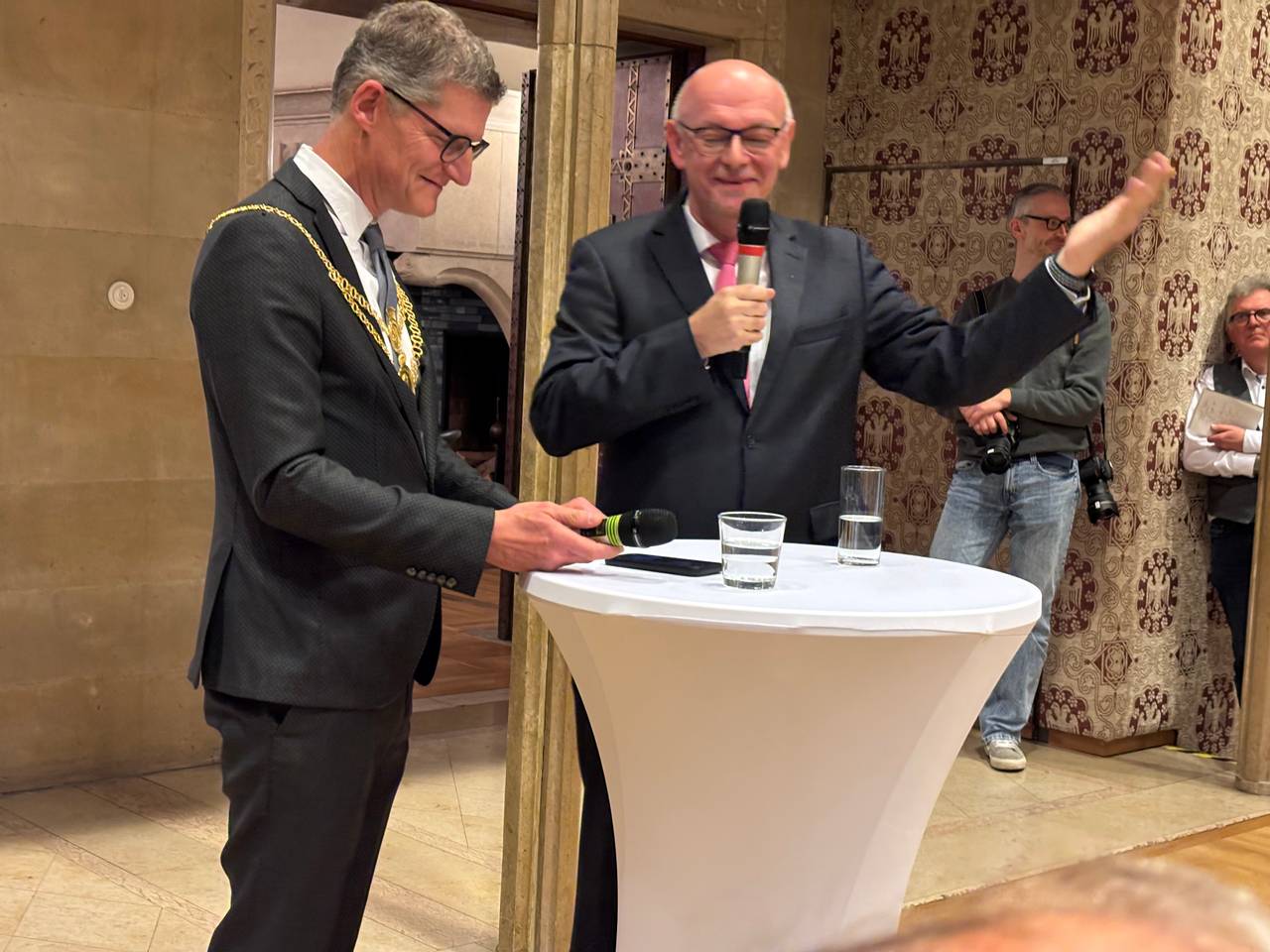 In seiner Rede bedankte sich Tilman Fuchs bei allen, die sich in Münster politisch und gesellschaftlich engagieren. Die Demokratie stehe auf dem Spiel, sagte er. Die radikalen Ränder in unserer Gesellschaft würden immer größer. Und in der Welt gebe es auch keine guten Zeichen. "Ist das das Ende des Völkerrechts?", habe er nach dem US-Angriff auf Venezuela gedacht. Der neue OB rief dazu auf, Dinge gemeinsam zu gestalten und nicht gegeneinander.