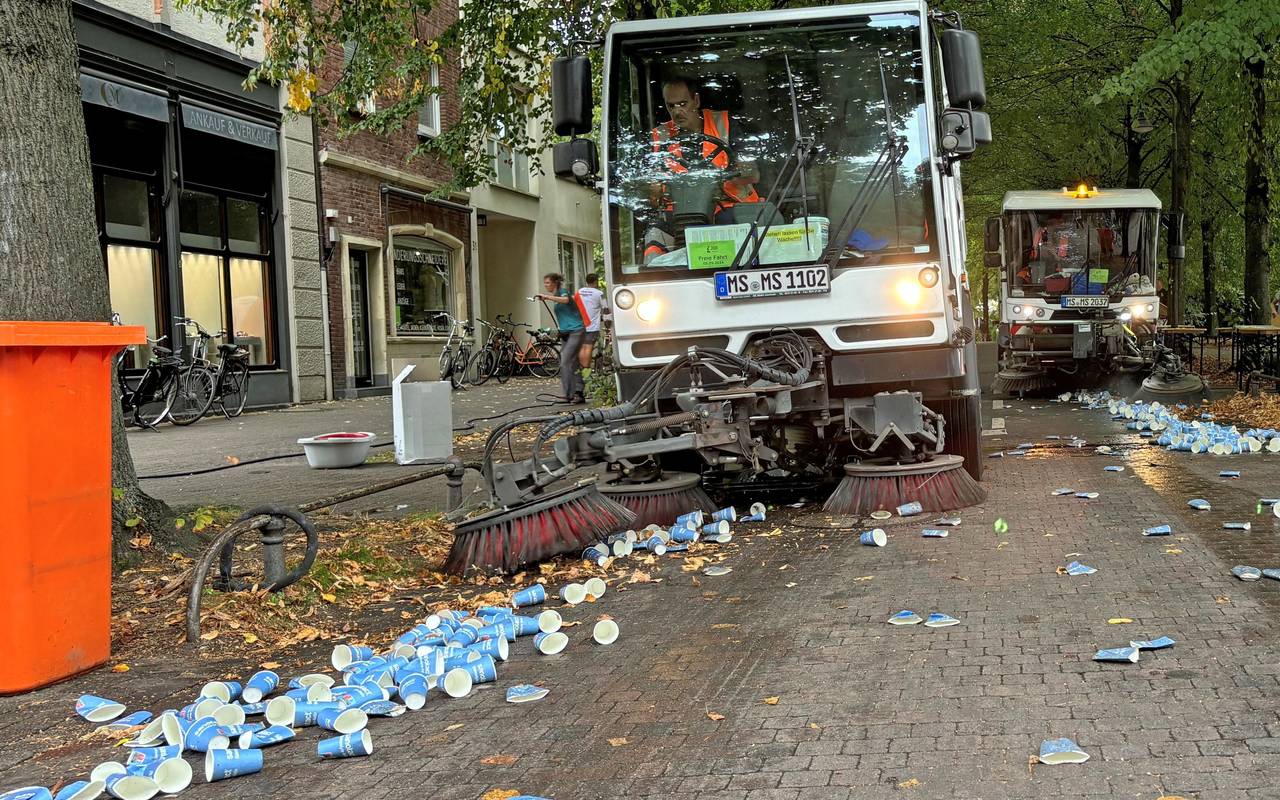 Die Abfallwirtschaftsbetriebe Münster (awm) sind am Sonntag (08.09.) von 8:30 Uhr bis 17:45 Uhr mit den Reinigungsarbeiten beschäftigt gewesen, bestehend aus einem sechsköpfigem Team mit zwei Großkehrmaschinen, einem Abfallsammel- und einem Containerfahrzeug. Im Vergleich zum Vorjahr ist weniger Müll angefallen: In diesem Jahr waren es rund 4,2 Tonnen Müll, im vergangenen Jahr 4,5 Tonnen Müll. Frank Raab, Einsatzleiter der Abfallwirtschaftsbetriebe Münster, sagt: