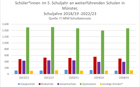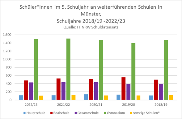 Die Verteilung bleibt dabei recht konstant. Die größte Differenz zum Vorjahr besteht bei den Realschulen - diese nehmen in diesem Schuljahr knapp 100 Kinder mehr auf, was einem Anstieg von 3,5% entspricht. Die Zahlen für Gesamtschulen bleiben konstant, nachdem es dort zum Jahr 2020/21 einen merklichen Anstieg aufgrund des Ausbaus der Mathilde-Anneke-Gesamtschule gab.